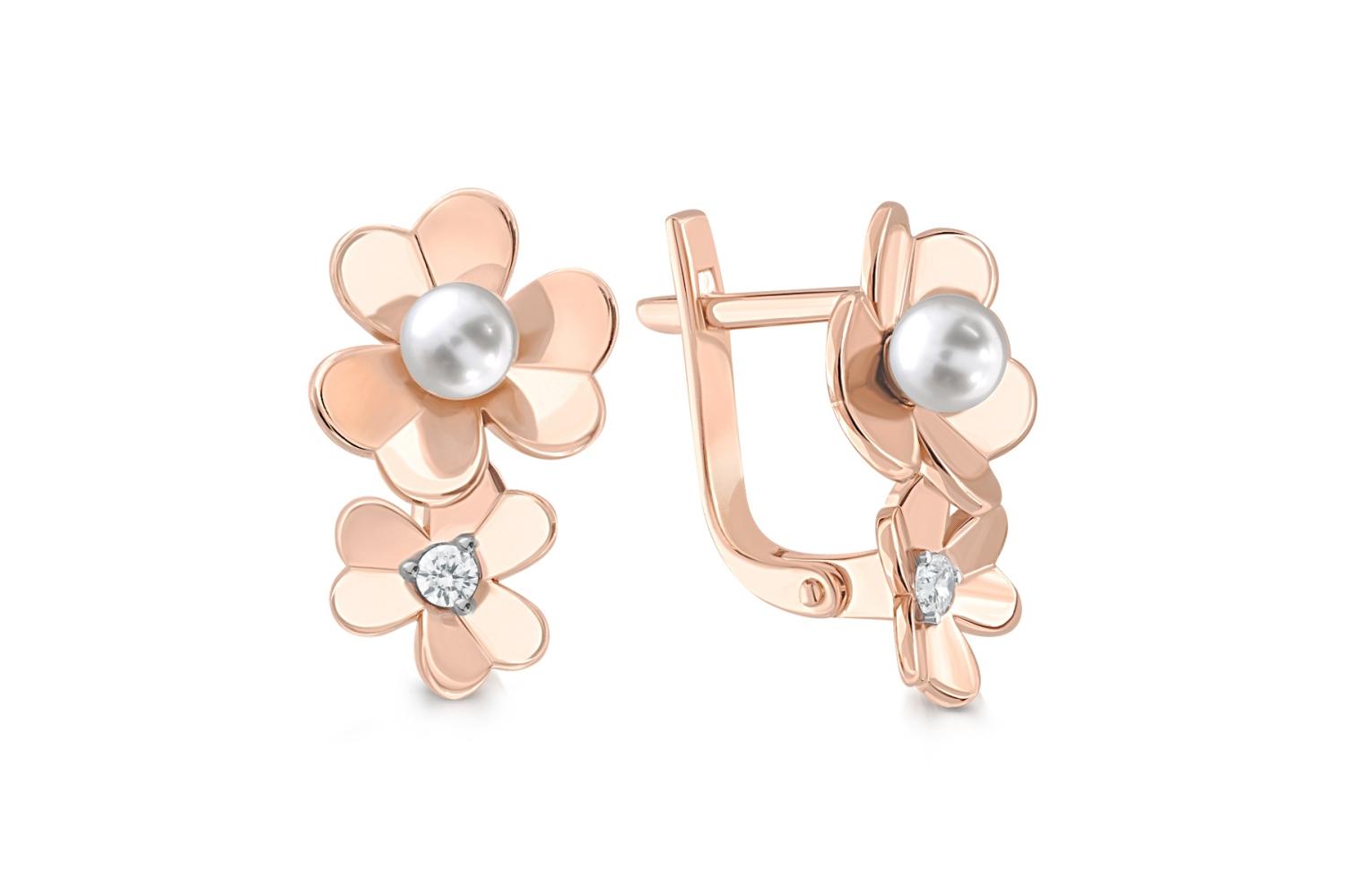 Мастера компании NEWGOLD, приложив всё свое мастерство и искусство, создали для Вас на нашем собственном производстве Серьги Цветы из красного золота с 2 жемчужинами и 2 фианитами.