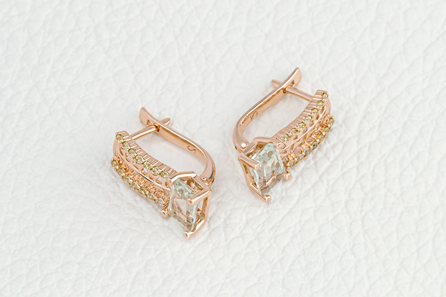 Мастера компании NEWGOLD, приложив всё свое мастерство и искусство, создали для Вас на нашем собственном производстве Серьги из красного золота с 2 празиолитами и 28 фианитами.