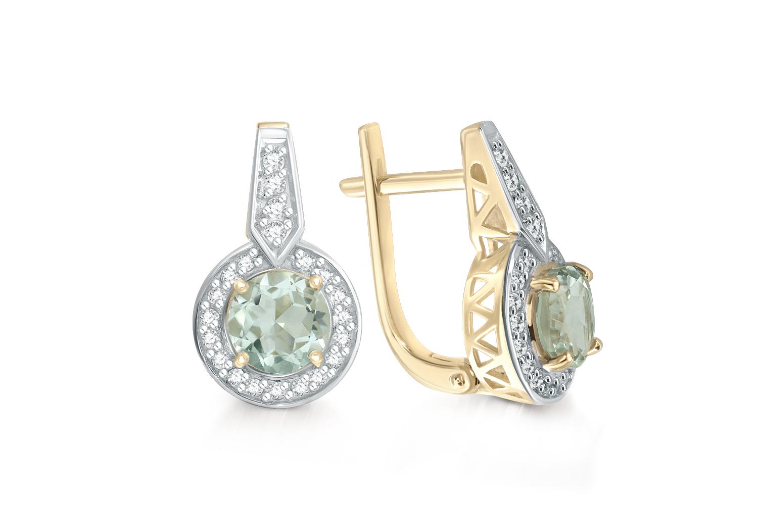 Аметист зеленый натуральный, количество 2 шт., огранка круг, размер 6 мм ; Фианит б/цв, количество 8 шт., огранка круг, размер 1,25 мм ; Фианит б/цв, количество 34 шт., огранка круг, размер 1 мм