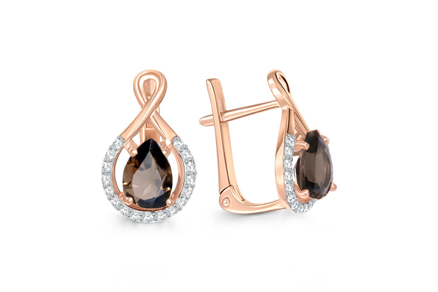 Мастера компании NEWGOLD, приложив всё свое мастерство и искусство, создали для Вас на нашем собственном производстве Серьги из красного золота с 2 раухтопазами и 34 фианитами.