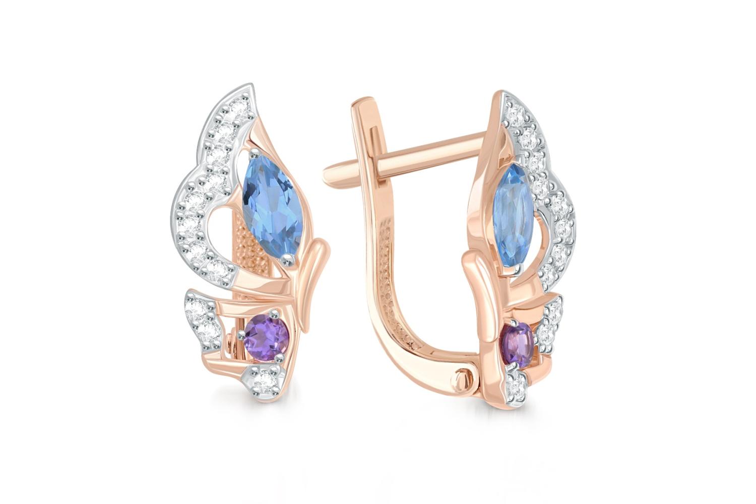 Мастера компании NEWGOLD, приложив всё свое мастерство и искусство, создали для Вас на нашем собственном производстве Серьги Бабочки из красного золота с топазами swiss, фианитами и аметистами.