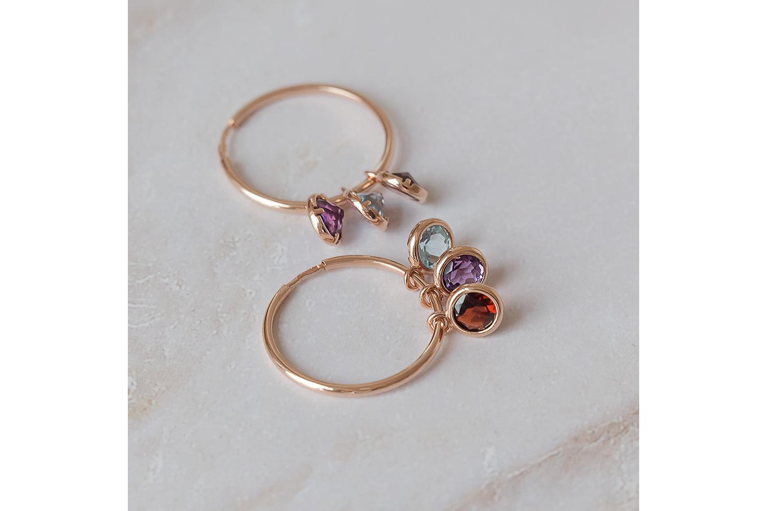 Мастера компании NEWGOLD, приложив всё свое мастерство и искусство, создали для Вас на нашем собственном производстве Серьги из красного золота с аметистами, гранатами и топазами sky.