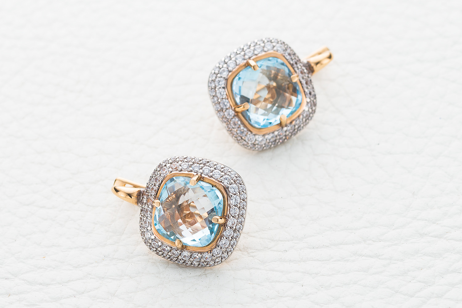 Мастера компании NEWGOLD, приложив всё свое мастерство и искусство, создали для Вас на нашем собственном производстве Серьги из красного золота с 2 топазами sky и 136 фианитами.