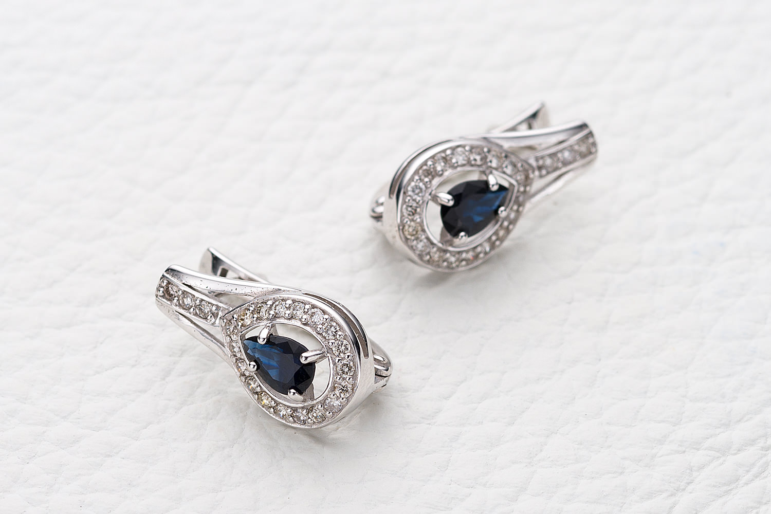 Сапфир натуральный, количество 2 шт., огранка груша, размер 6ˣ4, цвет 2, чистота 2, вес 0,83 карат. ; Бриллиант, количество 42 шт., огранка Кр-57, размер 1,25 мм, цвет 4, чистота 5, вес 0,36 карат.