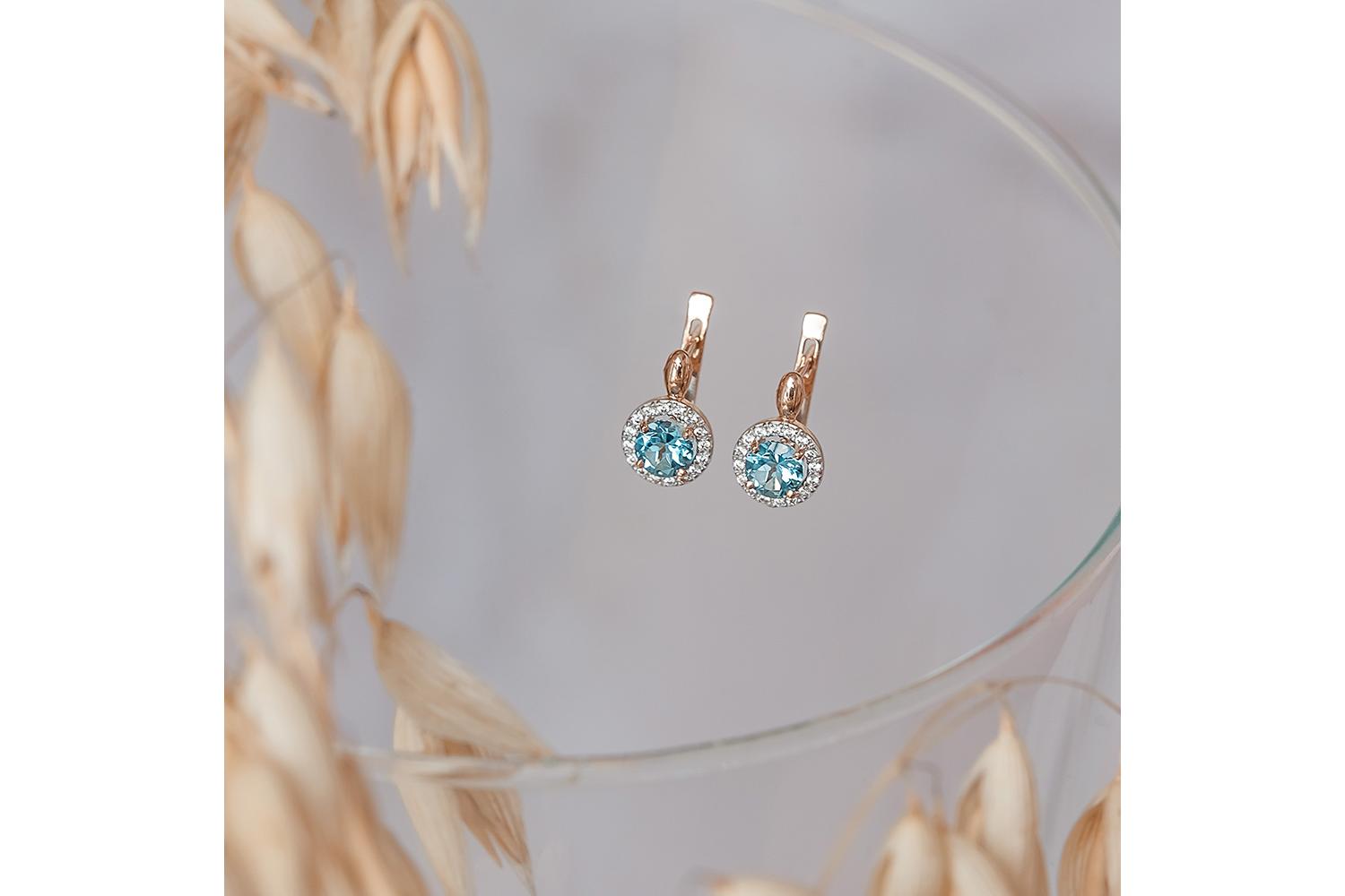 Металл: Золото, цвет: Красный , проба: 585. Вставки: Топаз Swiss натуральный, количество 2 шт. , огранка круг, размер 5 мм ; Фианит б/цв, количество 32 шт. , огранка круг, размер 1 мм.