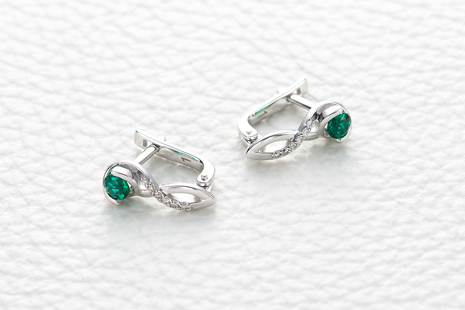 Изумруд Гт искусственный, количество 2 шт., огранка круг, размер 3,5 мм ; Бриллиант, количество 12 шт., огранка Кр-57, размер 1 мм, цвет 4, чистота 5, вес 0,06 карат.