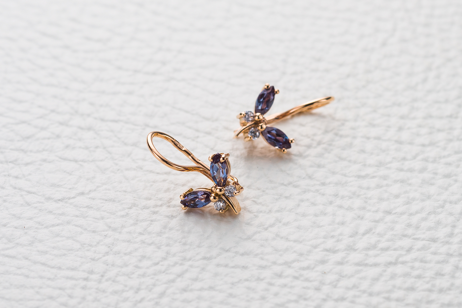 Мастера компании NEWGOLD, приложив всё свое мастерство и искусство, создали для Вас на нашем собственном производстве Детские серьги Бабочки из красного золота с 4 александритами и 4 фианитами.