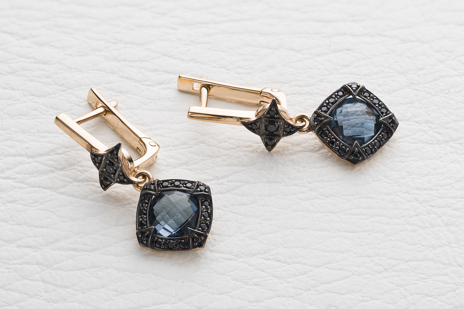 Топаз лондон натуральный, количество 2 шт., огранка антик-бриолет, размер 6ˣ6 ; Фианит чёрный, количество 2 шт., огранка круг, размер 1,5 мм ; Фианит чёрный, количество 40 шт., огранка круг, размер 1 мм