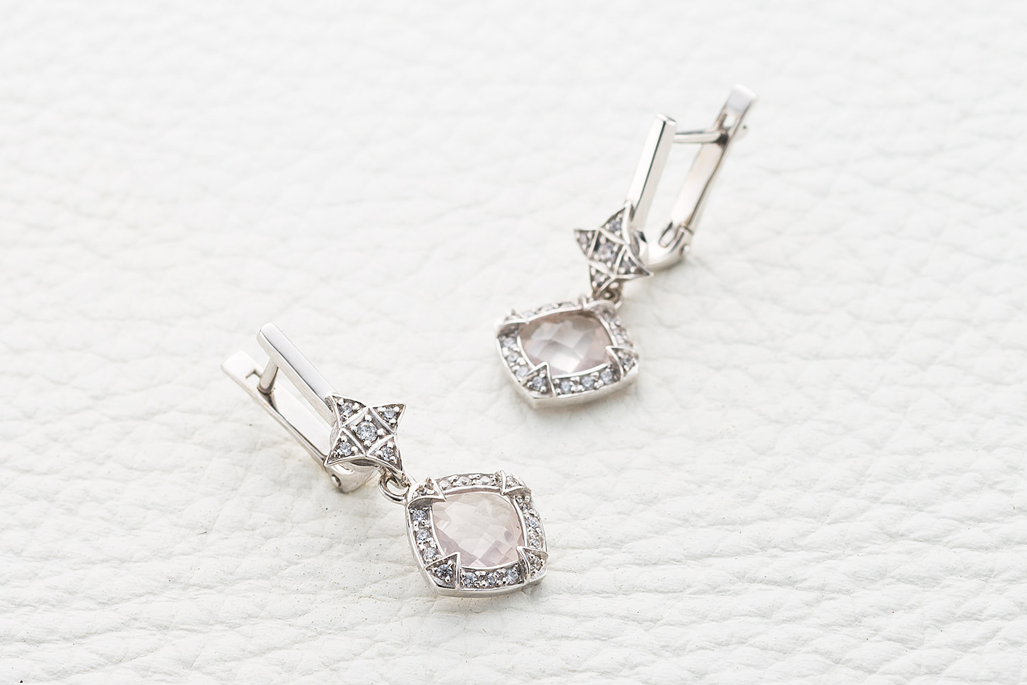 Кварц Розовый натуральный, количество 2 шт., огранка антик-бриолет, размер 6ˣ6 ; Фианит б/цв, количество 2 шт., огранка круг, размер 1,5 мм ; Фианит б/цв, количество 40 шт., огранка круг, размер 1 мм