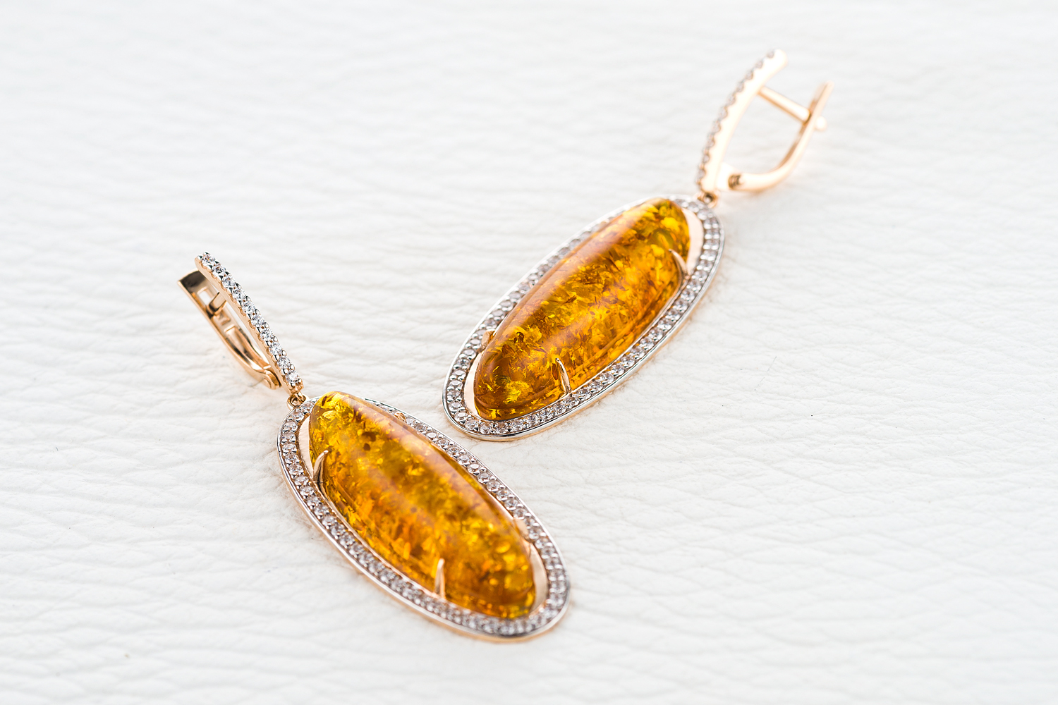 Мастера компании NEWGOLD, приложив всё свое мастерство и искусство, создали для Вас на нашем собственном производстве Серьги из красного золота с янтарём и 132 фианитами.