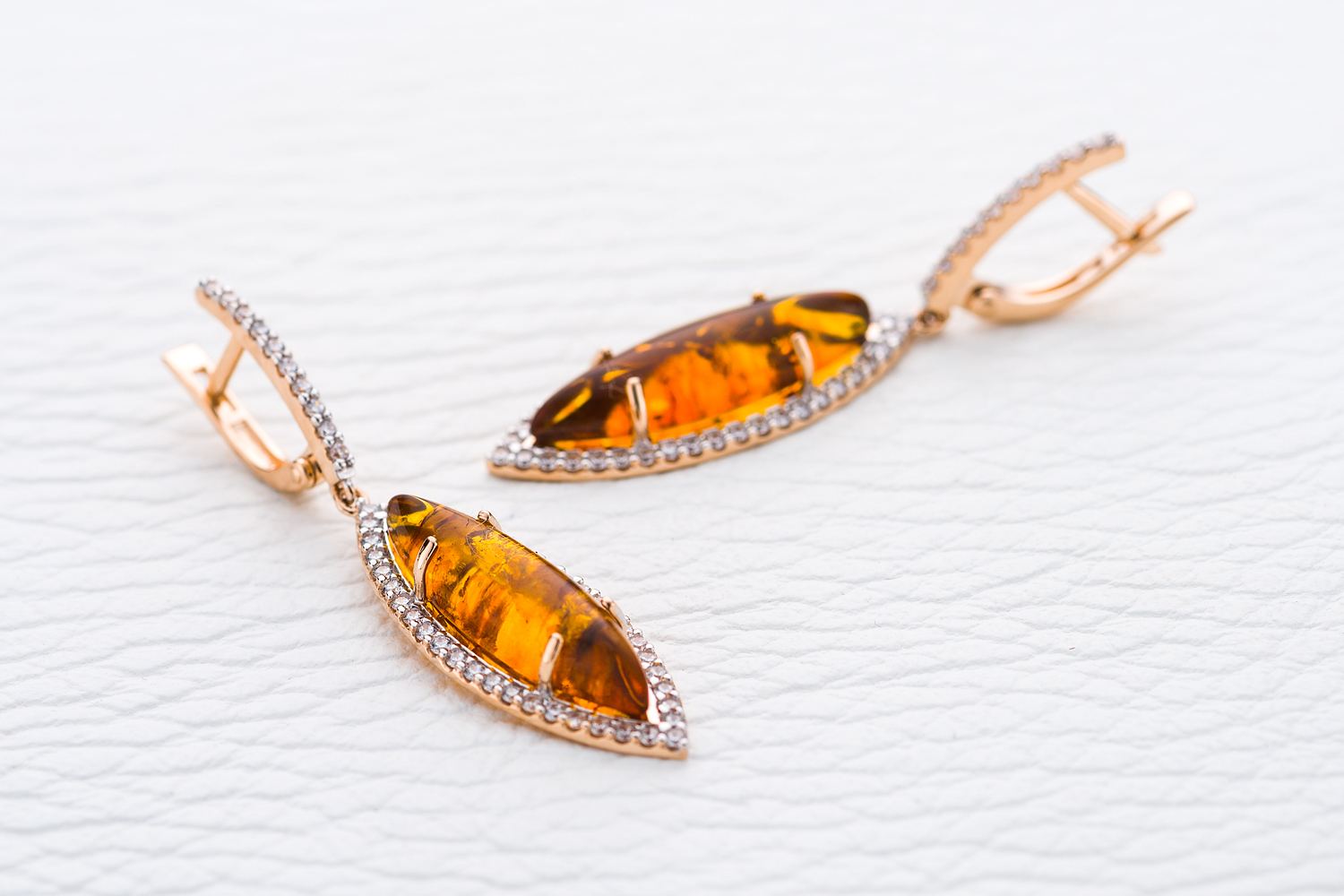 Мастера компании NEWGOLD, приложив всё свое мастерство и искусство, создали для Вас на нашем собственном производстве Серьги из красного золота с янтарём и 100 фианитами.