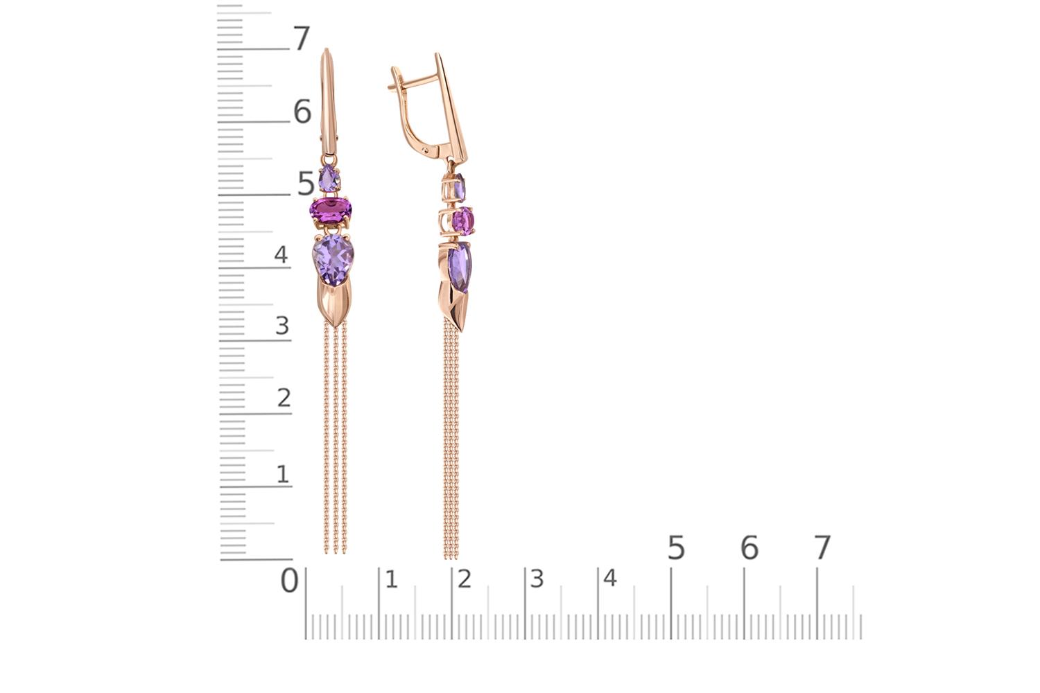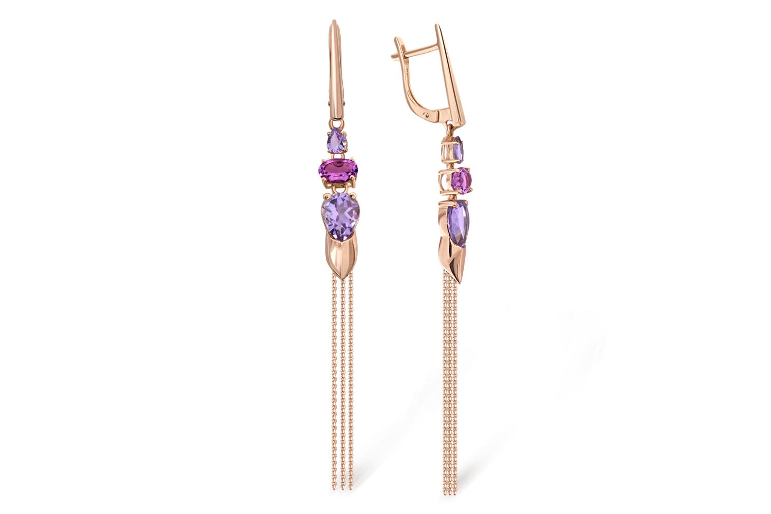 Мастера компании NEWGOLD, приложив всё свое мастерство и искусство, создали для Вас на нашем собственном производстве Серьги из красного золота с 4 аметистами и 2 родолитами.