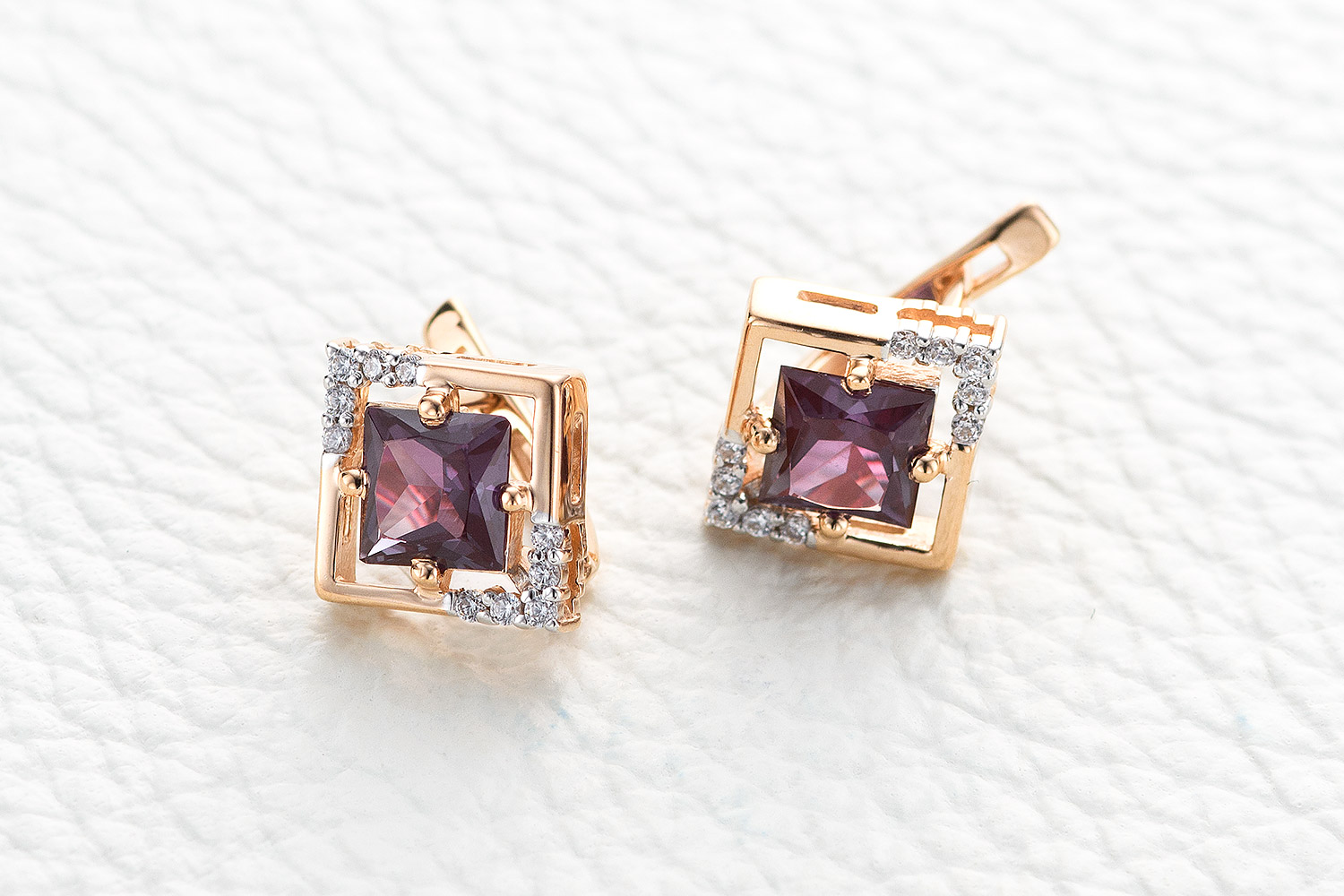Мастера компании NEWGOLD, приложив всё свое мастерство и искусство, создали для Вас на нашем собственном производстве Серьги Квадраты из красного золота с 2 александритами и 20 фианитами.