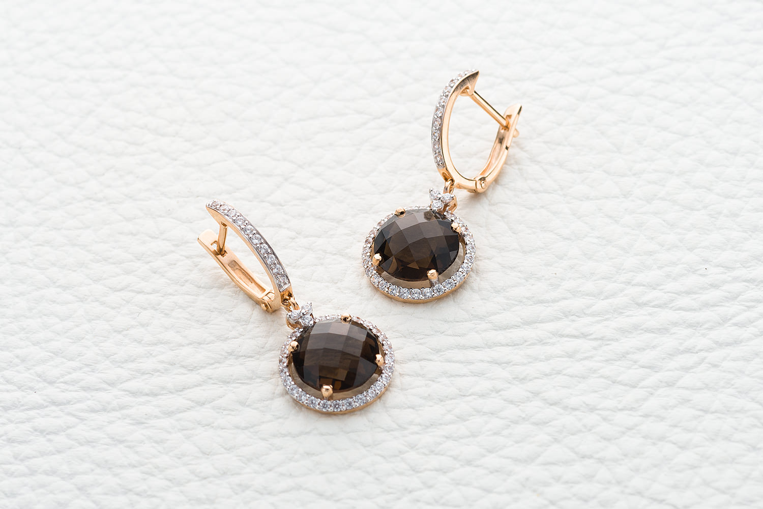 Мастера компании NEWGOLD, приложив всё свое мастерство и искусство, создали для Вас на нашем собственном производстве Серьги из красного золота с 2 раухтопазами и 78 фианитами.