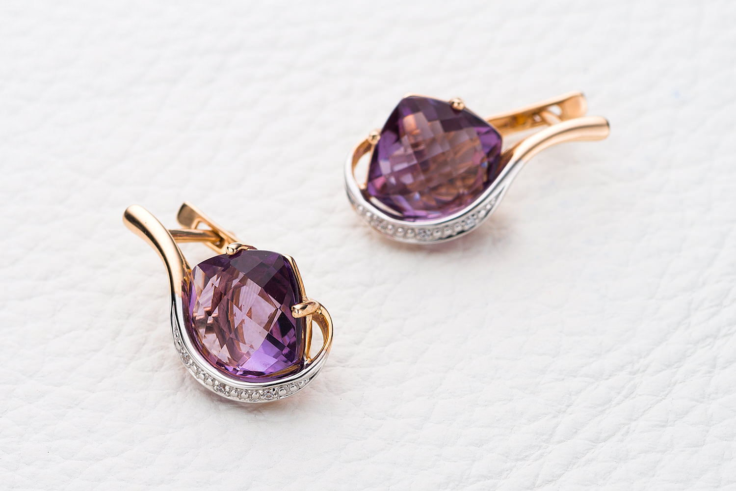 Мастера компании NEWGOLD, приложив всё свое мастерство и искусство, создали для Вас на нашем собственном производстве Серьги из красного золота с 2 аметистами и 6 фианитами.