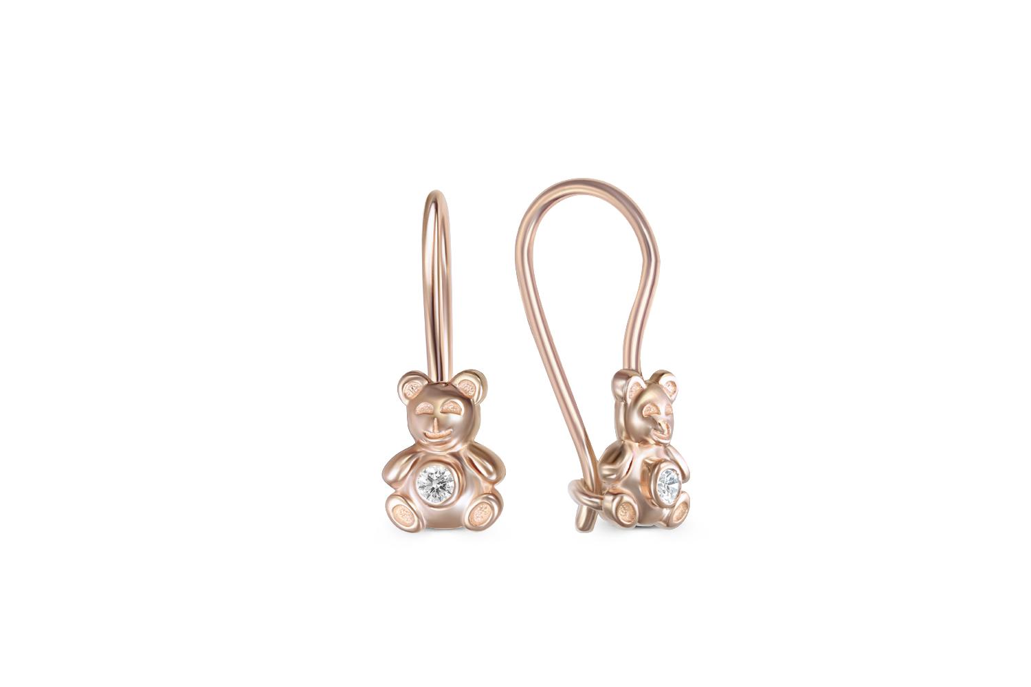 Мастера компании NEWGOLD, приложив всё свое мастерство и искусство, создали для Вас на нашем собственном производстве Детские серьги Мишки из красного золота с 2 фианитами.
