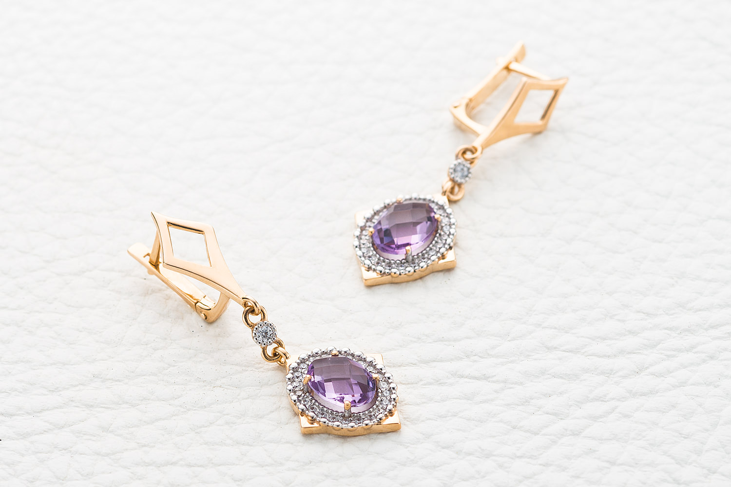 Мастера компании NEWGOLD, приложив всё свое мастерство и искусство, создали для Вас на нашем собственном производстве Серьги из красного золота с 2 аметистами и 46 фианитами.