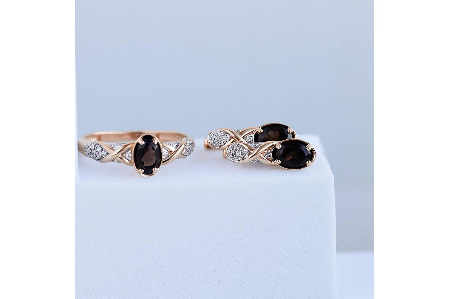 Раухтопаз натуральный, количество 2 шт., огранка овал, размер 6ˣ4 ; Фианит б/цв, количество 14 шт., огранка круг, размер 1 мм