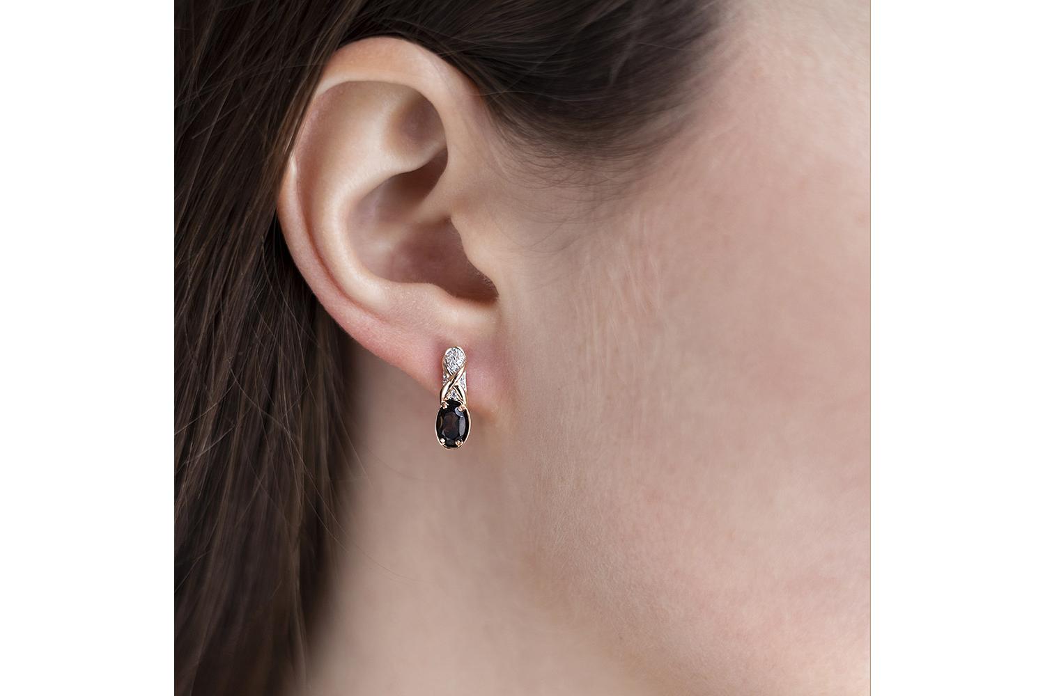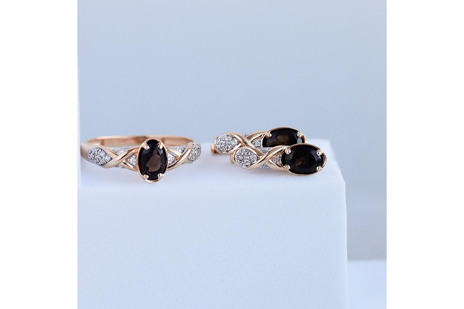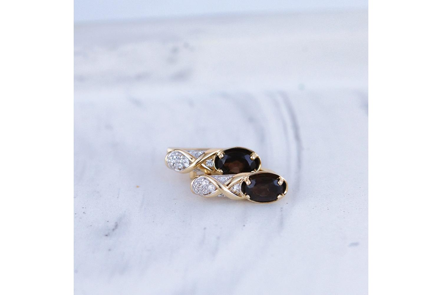 Изящные серьги из золота представляют собой элегантное ювелирное изделие с изысканным дизайном. Доминирующими элементами являются два овальных раухтопаза - каменья теплого коричневого оттенка, обрамленные в изящные золотые касты. Конструкция серёжек включает: - Плавно изогнутую форму с элементом "бесконечность" - Белые вкрапления фианитов, создающих контраст с основным золотым тоном - Замок-застежку для удобного надевания Цветовая гамма представлена: - Нежно-желтым золотом основания - Серебристо-белыми вставками из фианитов - Коричневыми раухтопазами с глубоким благородным оттенком Украшение выглядит роскошно, демонстрируя высокий уровень ювелирного мастерства - плавные линии, безупречную огранку камней и тонкую проработку деталей.