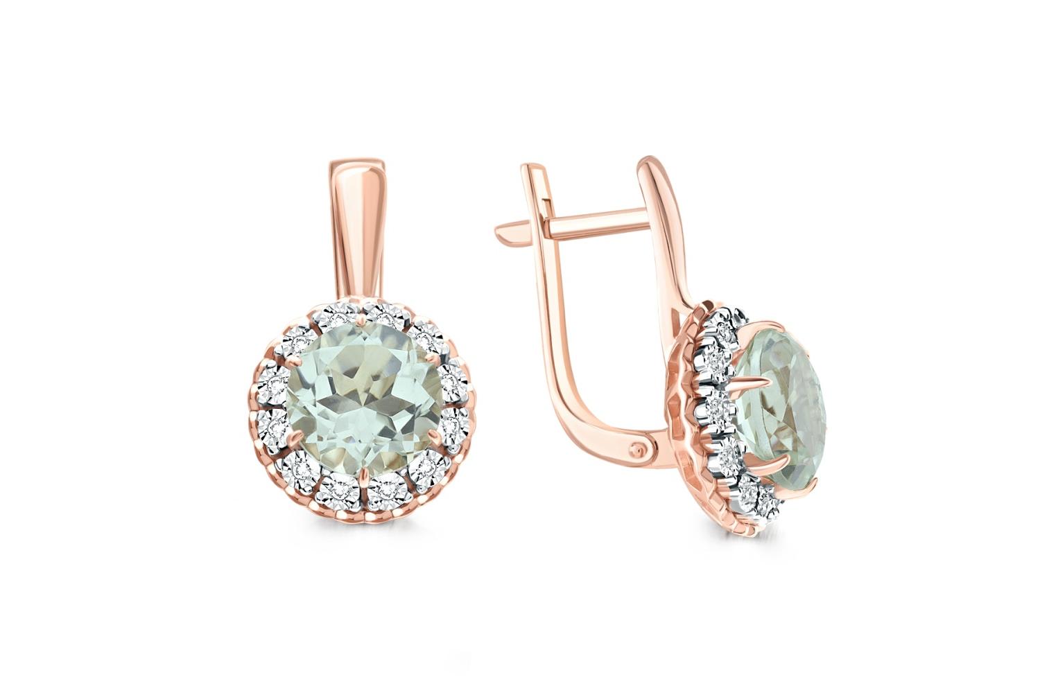 Мастера компании NEWGOLD, приложив всё свое мастерство и искусство, создали для Вас на нашем собственном производстве Серьги из красного золота с 2 празиолитами и 24 бриллиантами.