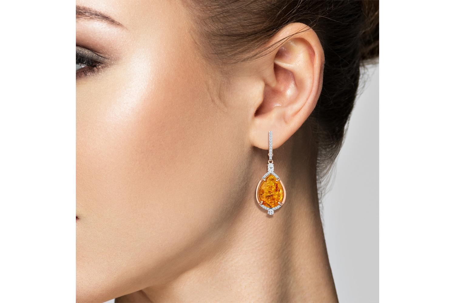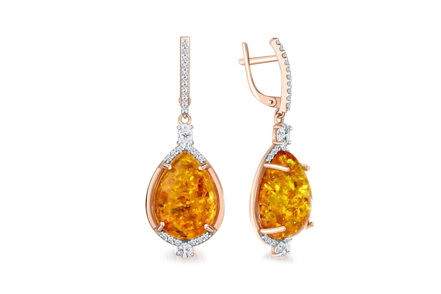 Мастера компании NEWGOLD, приложив всё свое мастерство и искусство, создали для Вас на нашем собственном производстве Серьги из красного золота с янтарём и 48 фианитами.
