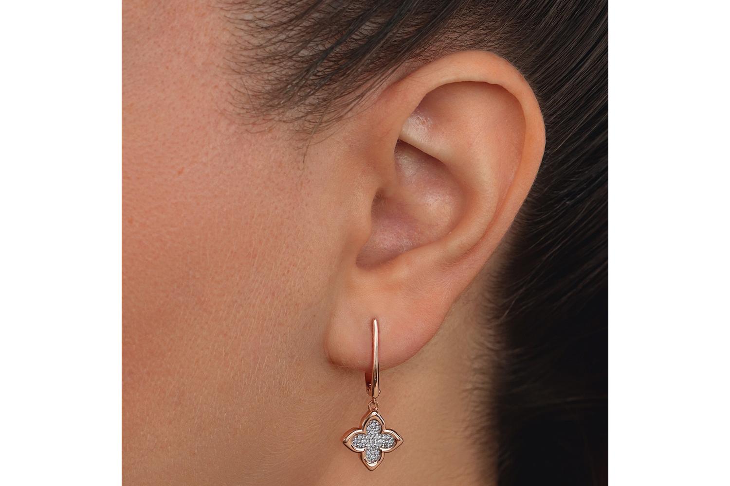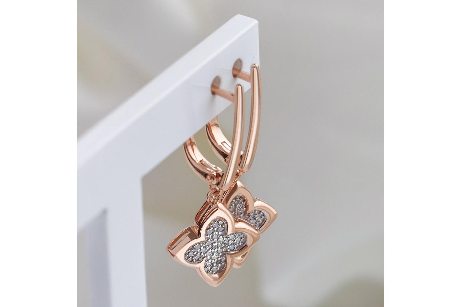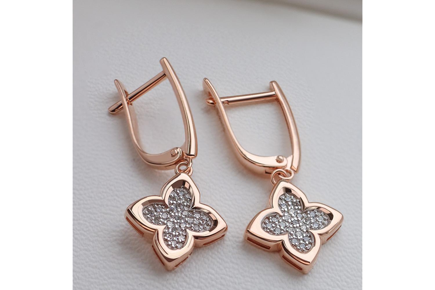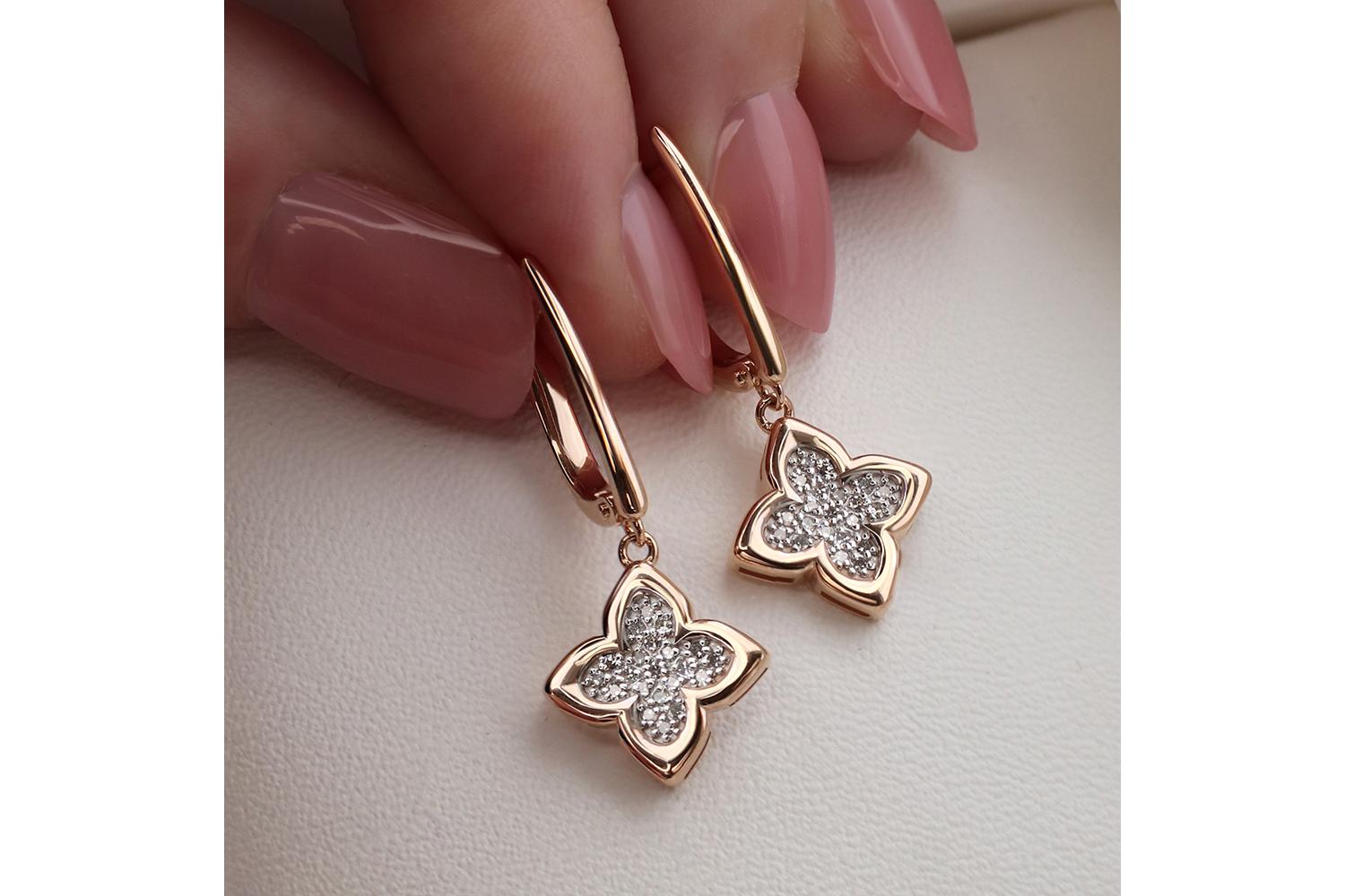 Мастера компании NEWGOLD, приложив всё свое мастерство и искусство, создали для Вас на нашем собственном производстве Серьги Клевер из красного золота с 42 фианитами.