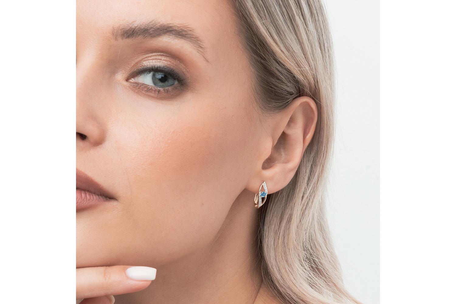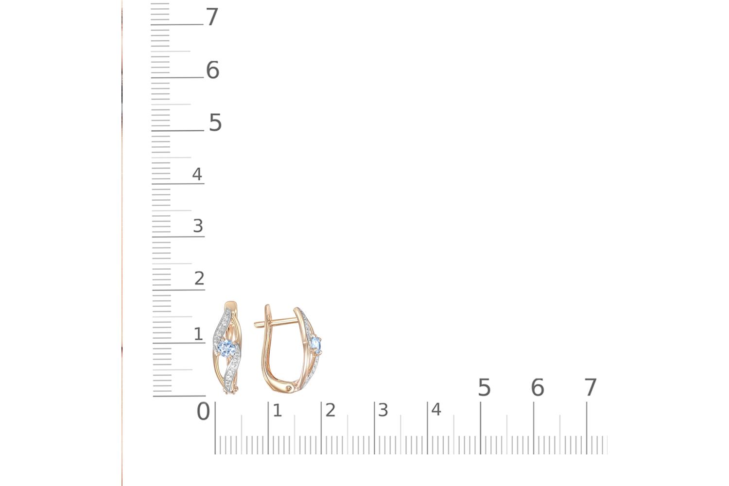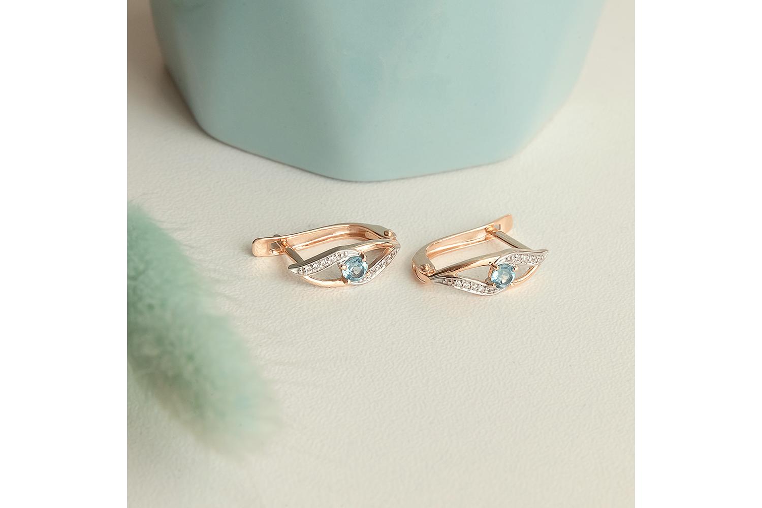 Изящные серьги из красного золота - истинное воплощение элегантности и женственности. Дизайн серёжек напоминает плавную волну - изогнутая форма подчеркивает мягкие линии. В центре каждой серьги - нежно-голубой топаз огранки круг, который словно танцует в обрамлении россыпи мельчайших фианитов. Технические характеристики: - Материал: красное золото 585 пробы - Вставки: 2 топаза (голубого оттенка) - Дополнительные камни: 16 фианитов - Тип застёжки: английская Изысканное ювелирное изделие подчеркнет утонченность и женственность, станет прекрасным дополнением как к вечернему, так и к повседневному образу.