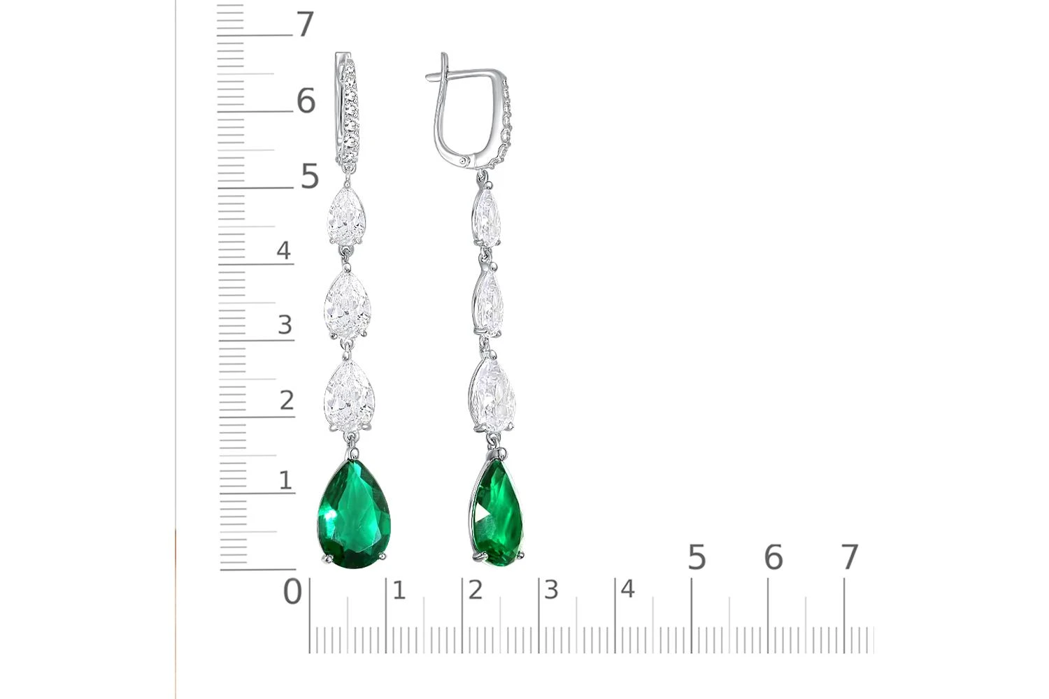 Изумруд Гт искусственный, количество 2 шт., огранка груша, размер 15ˣ10 ; Фианит б/цв, количество 2 шт., огранка груша, размер 10ˣ7 ; Фианит б/цв, количество 2 шт., огранка груша, размер 9ˣ6 ; Фианит б/цв, количество 2 шт., огранка груша, размер 8ˣ5 ;
