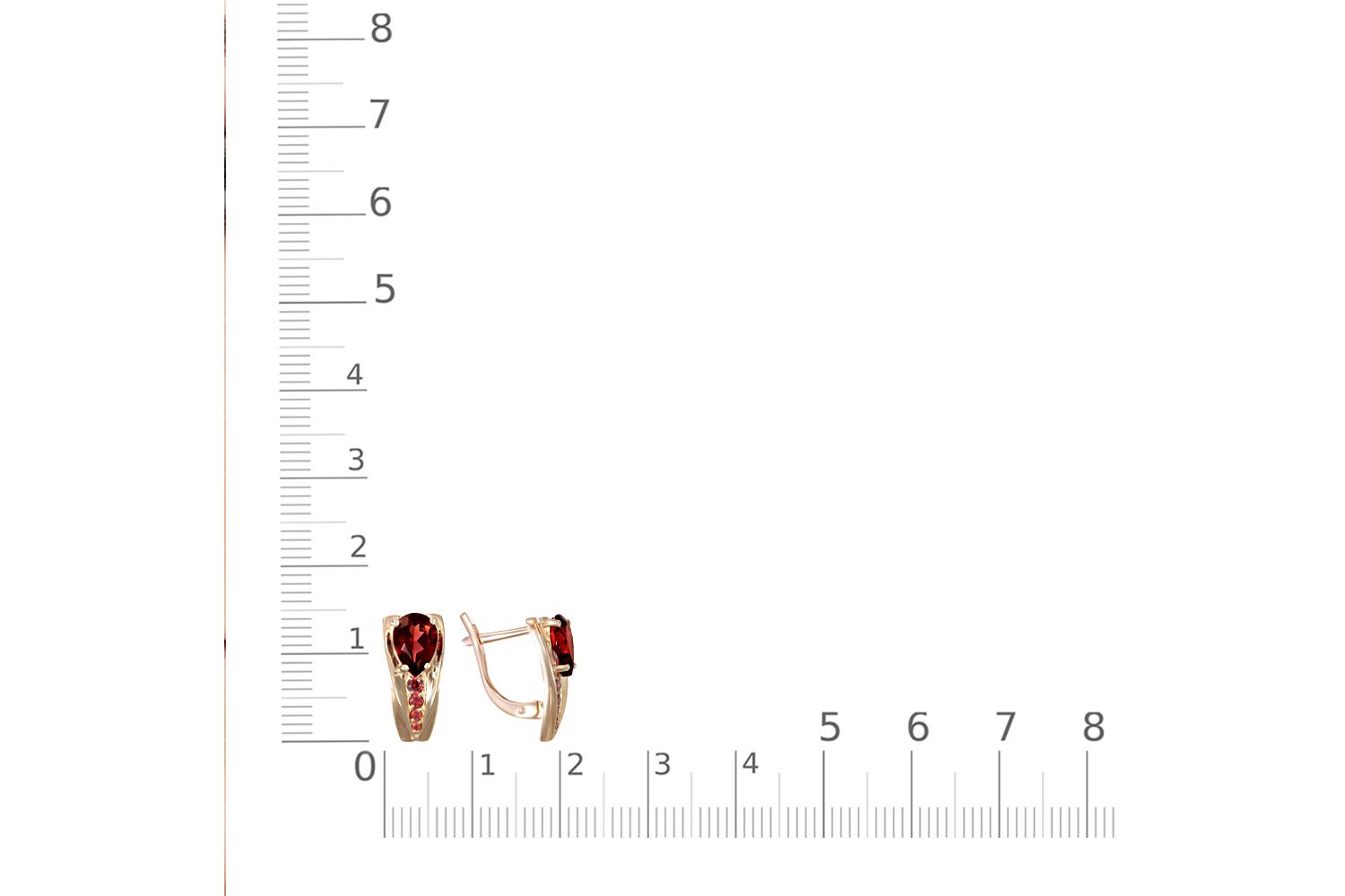 Гранат натуральный, количество 2 шт., огранка груша, размер 7ˣ5 ; Фианит красный, количество 2 шт., огранка круг, размер 1,75 мм ; Фианит красный, количество 2 шт., огранка круг, размер 1,5 мм ; Фианит красный, количество 2 шт., огранка круг, размер 1,