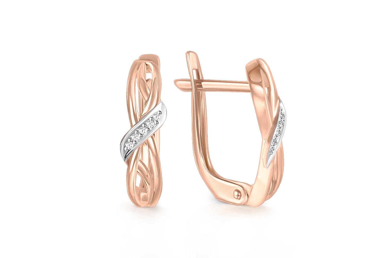 Изящные серьги из красного золота 585 пробы с белыми вкраплениями бриллиантов притягивают взгляд своей элегантной формой. Плавные изгибы металла создают впечатление мягкой волны, а миниатюрные бриллианты - словно капельки света - подчеркивают изысканность украшения. Дизайн серёжек отличается продуманностью - замок-застёжка удобно фиксируется, а изящный корпус имеет неповторимый рельефный узор. Каждая деталь выглядит невесомой и воздушной, что делает серьги по-настоящему женственным аксессуаром.