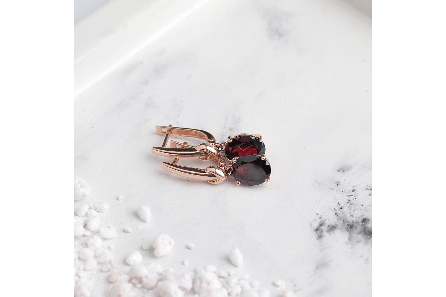 Мастера компании NEWGOLD, приложив всё свое мастерство и искусство, создали для Вас на нашем собственном производстве Серьги из красного золота с 2 гранатами.
