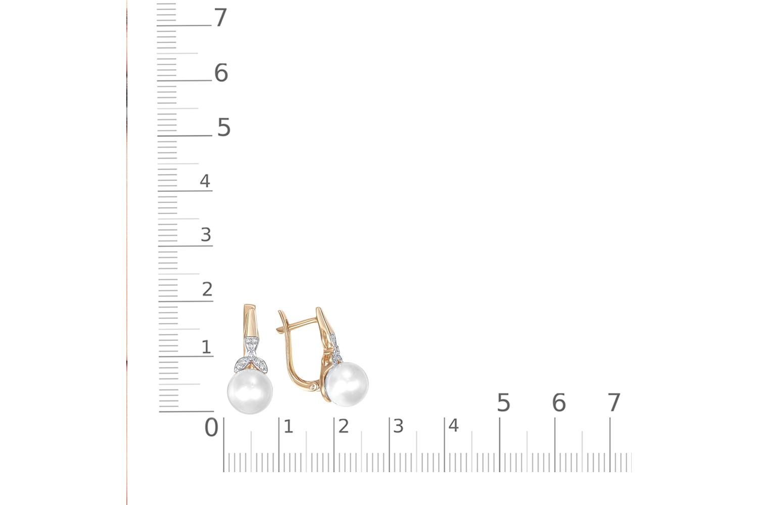Жемчуг белый натуральный, количество 2 шт., огранка круг, размер 8ˣ8,5 ; Бриллиант, количество 2 шт., огранка Кр-17, размер 1 мм, цвет 2, чистота 3, вес 0,008 карат. ; Бриллиант, количество 14 шт., огранка Кр-17, размер 0,9 мм, цвет 2, чистота 2, вес 0,