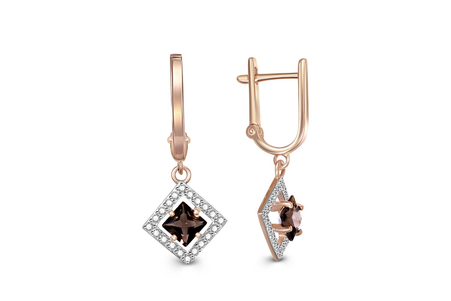 Мастера компании NEWGOLD, приложив всё свое мастерство и искусство, создали для Вас на нашем собственном производстве Серьги из красного золота с 2 раухтопазами и 40 фианитами.