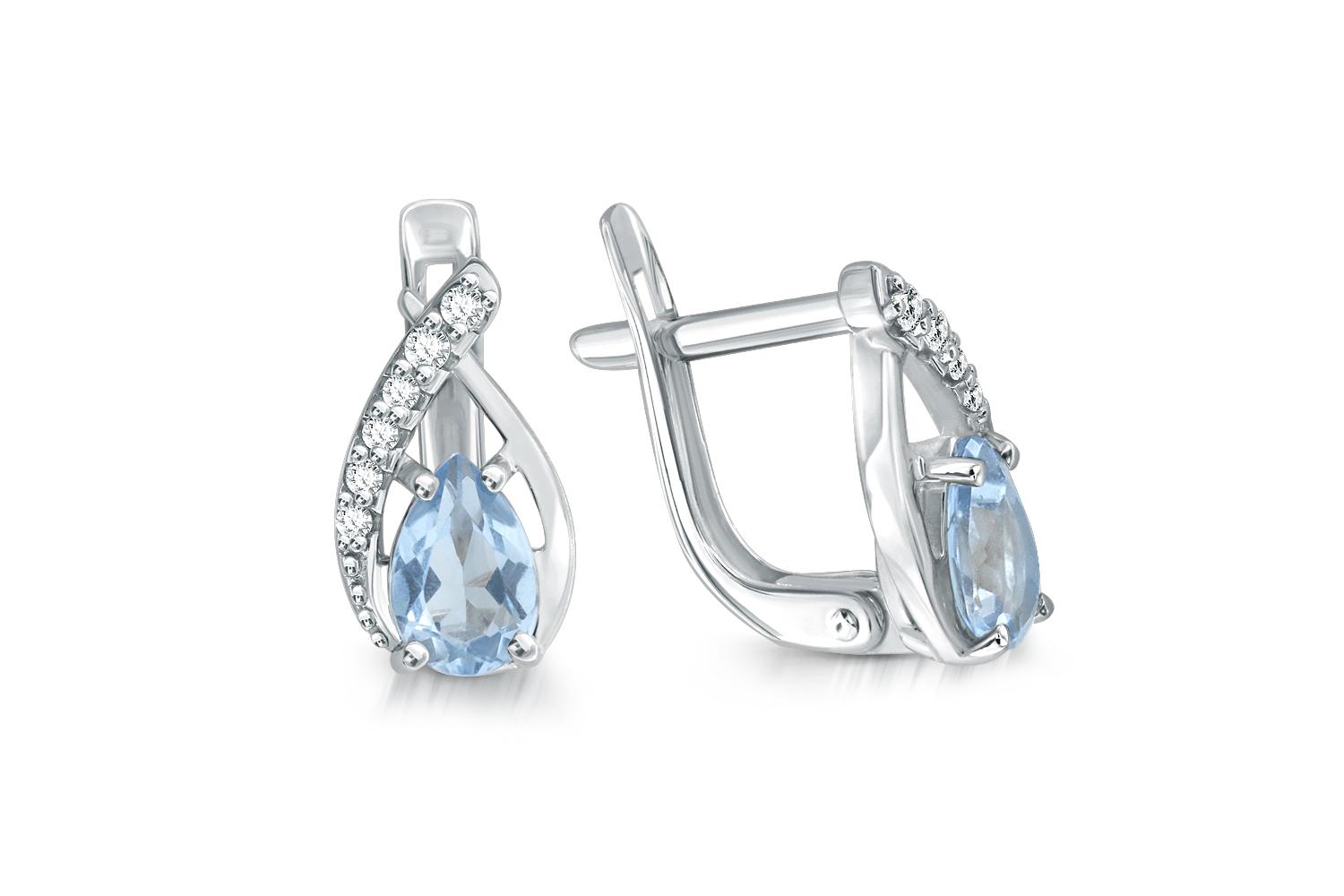 Мастера компании NEWGOLD, приложив всё свое мастерство и искусство, создали для Вас на нашем собственном производстве Серьги из белого золота с 2 топазами sky и 12 фианитами.
