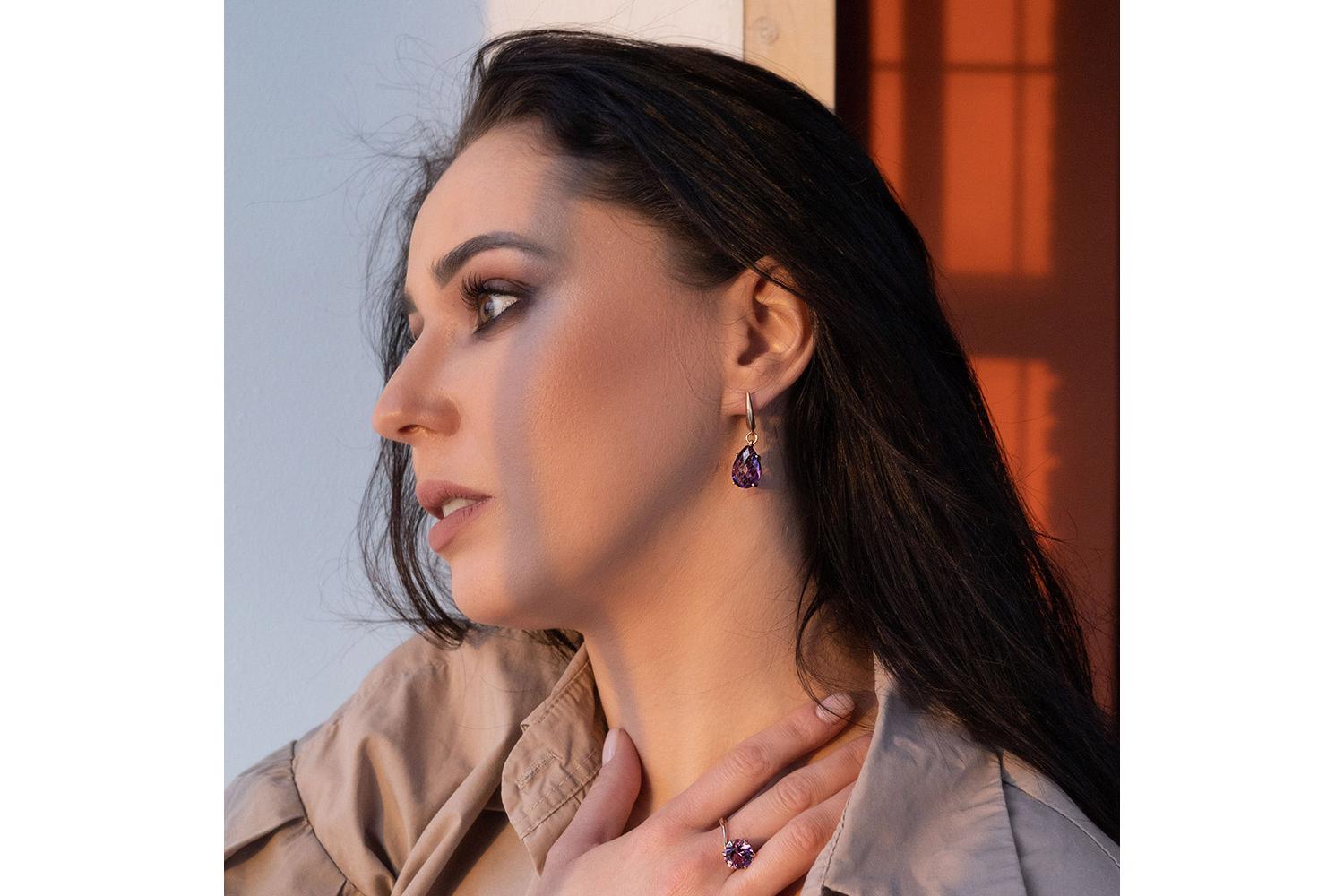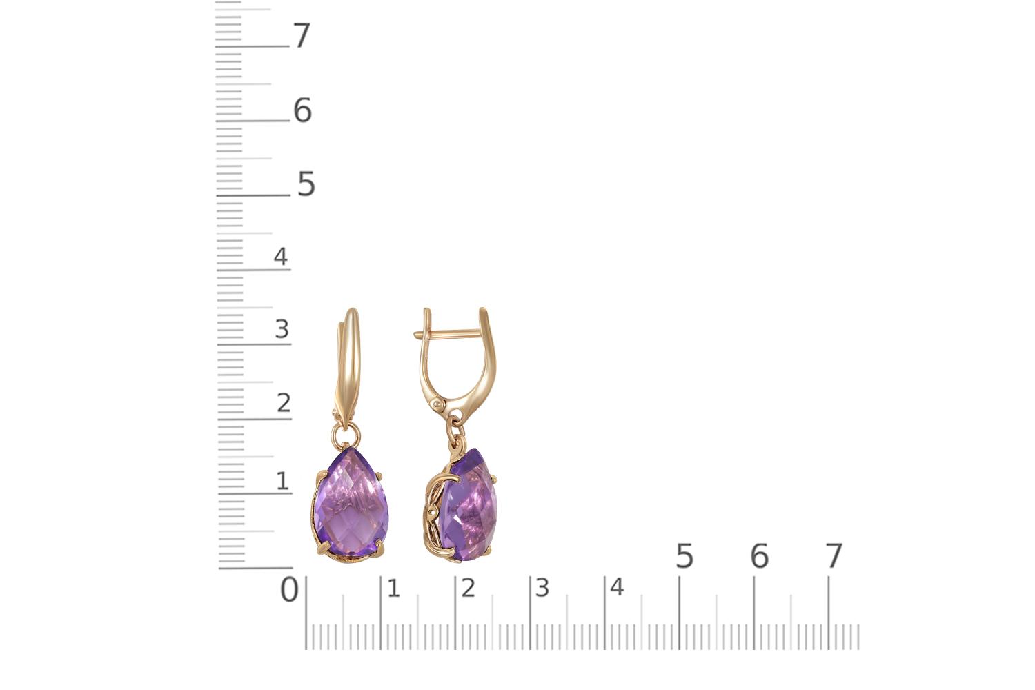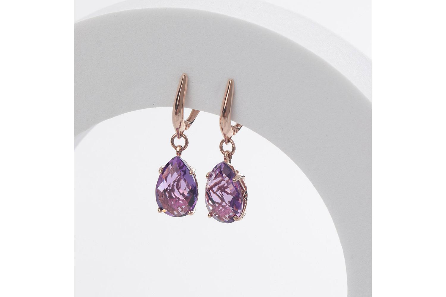 Изящные серьги из красного золота с аметистами - истинное воплощение элегантности и природной красоты. Камни имеют форму граненых капель, что подчеркивает их природное сияние и глубину фиолетового оттенка. Золотые оправы с тонкой филигранной работой нежно обхватывают камни, создавая впечатление легкости и воздушности.