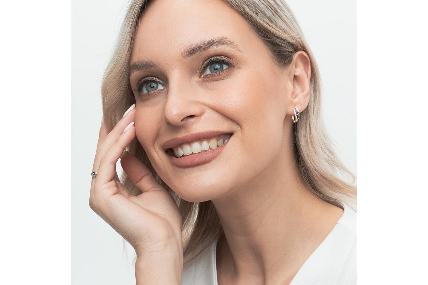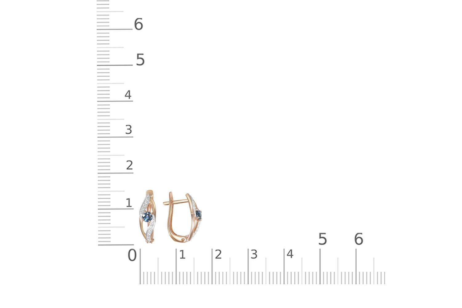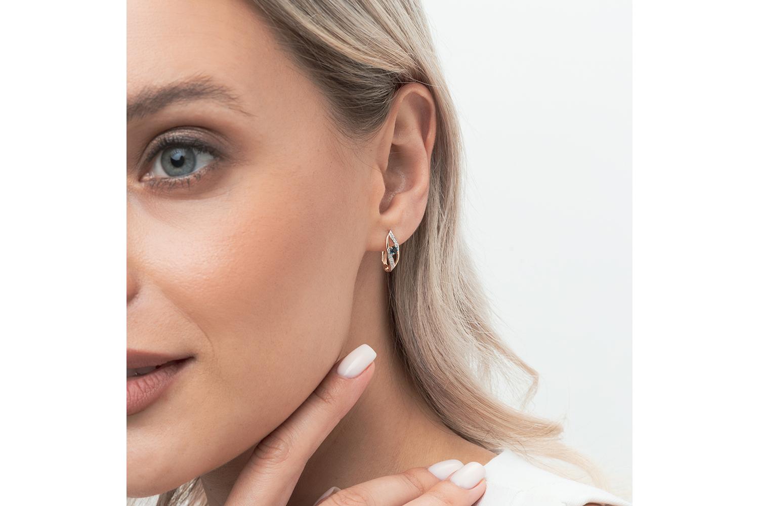 Изящные серьги красного золота представляют собой истинное воплощение ювелирного искусства. Центральным акцентом изделия служит топаз лондон спокойного синего цвета, который словно танцует в обрамлении изящных дорожек из белых фианитов.