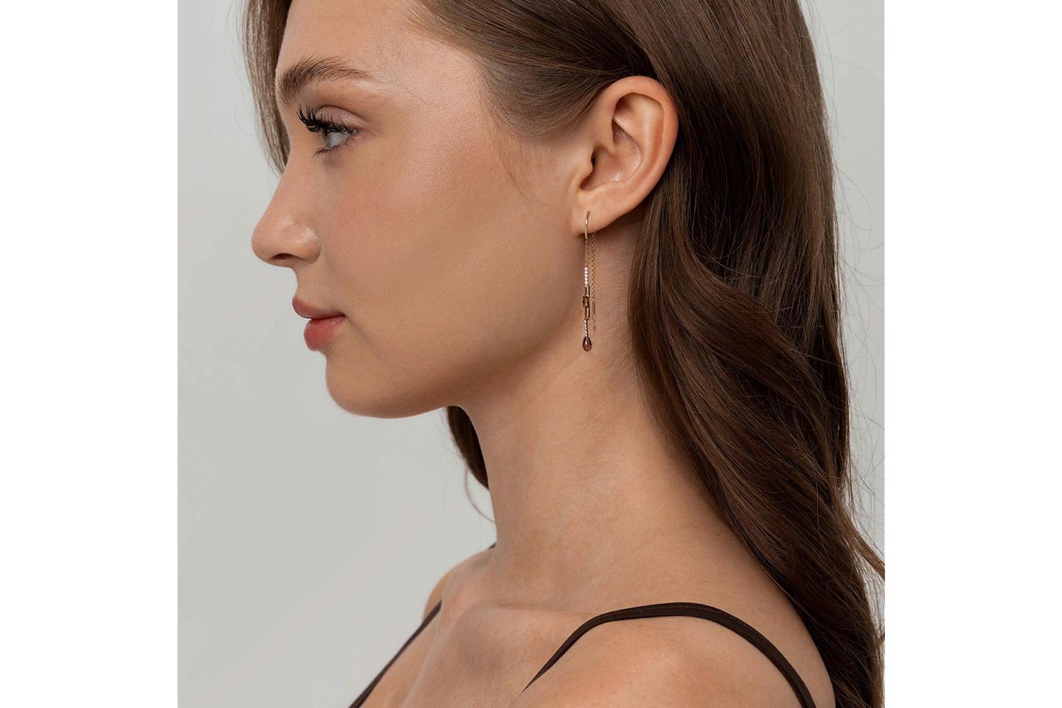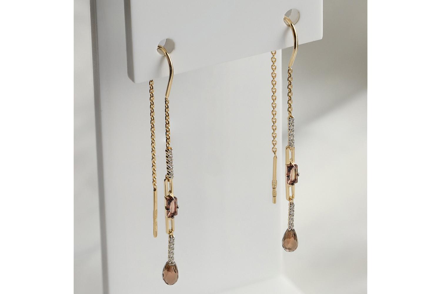 Эти женские серьги протяжки из золота 585 пробы с раухтопазами – идеальное украшение для создания утонченного образа. Их элегантные цепочки подчеркивают изящество длинных висячих аксессуаров, которые прекрасно подойдут для любого повода: будь то юбилей, день рождения, 8 марта или Новый год. Они станут прекрасным подарком любимой женщине – жене, сестре, племяннице, крестнице или внучке. Ювелирные украшения такого формата отличаются легкостью и стильной универсальностью.