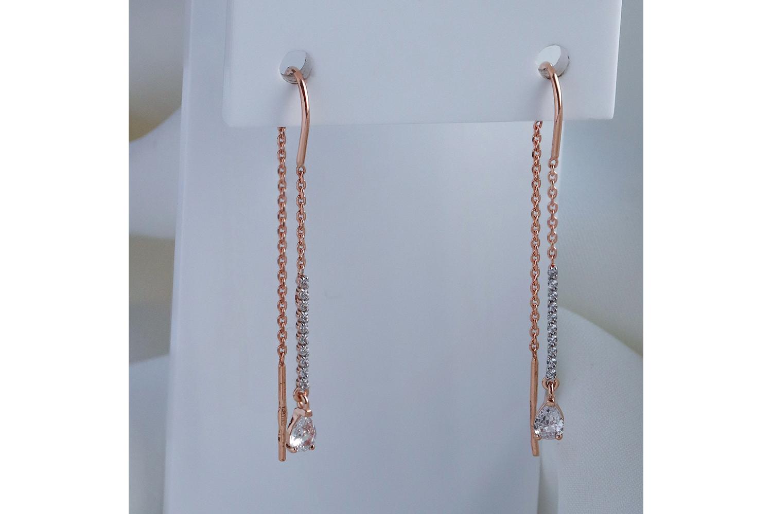 Эти женские серьги протяжки из красного золота 585 пробы с фианитами – идеальное украшение для создания утонченного образа. Их элегантные цепочки подчеркивают изящество длинных висячих аксессуаров, которые прекрасно подойдут для любого повода: будь то юбилей, день рождения, 8 марта или Новый год. Они станут прекрасным подарком любимой женщине – жене, сестре, племяннице, крестнице или внучке.