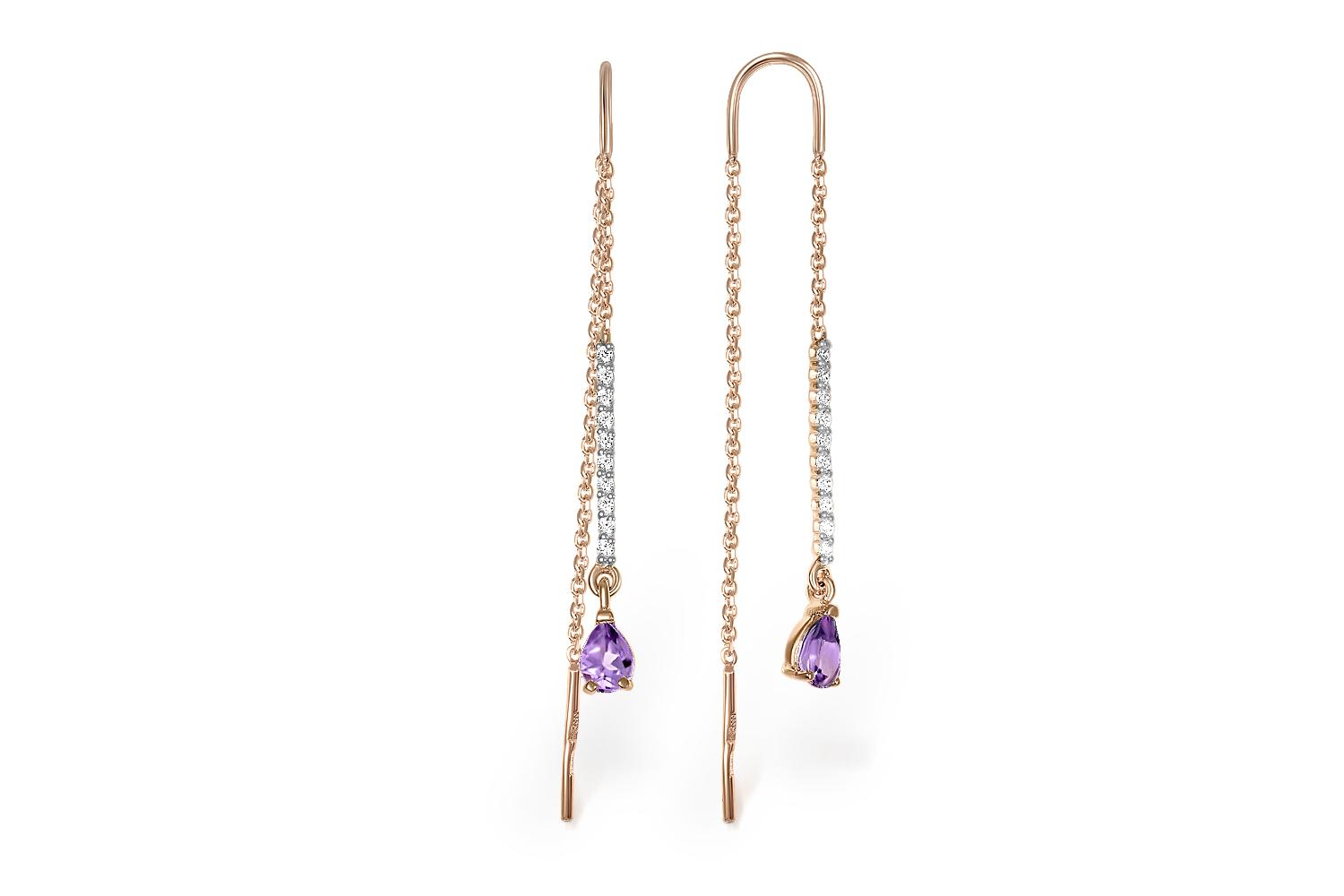 Мастера компании NEWGOLD, приложив всё свое мастерство и искусство, создали для Вас на нашем собственном производстве Серьги-продёвки Дорожки из красного золота с 2 аметистами и 20 фианитами.