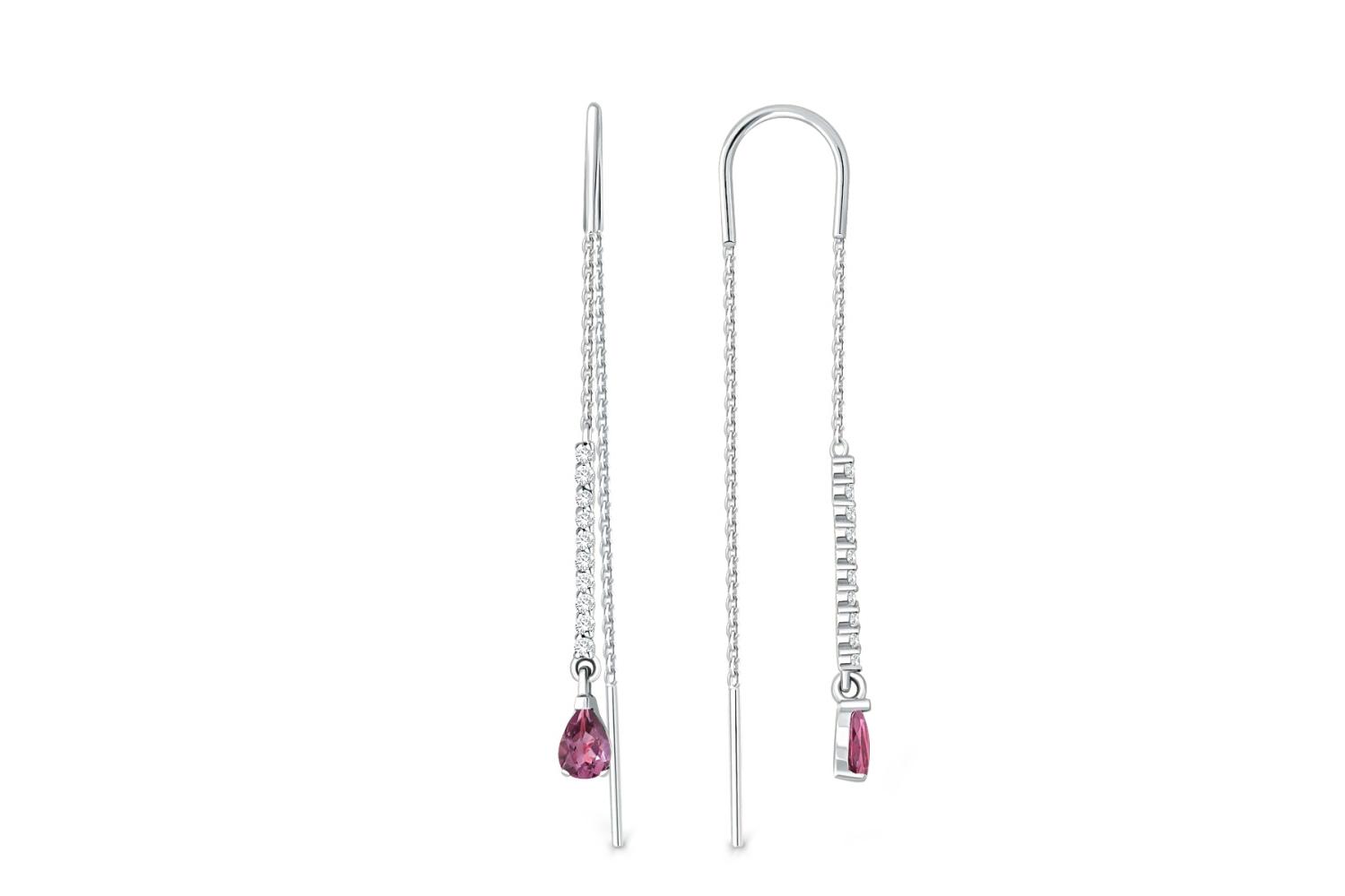 Мастера компании NEWGOLD, приложив всё свое мастерство и искусство, создали для Вас на нашем собственном производстве Серьги-продёвки Дорожки из белого золота с 2 родолитами и 20 фианитами.