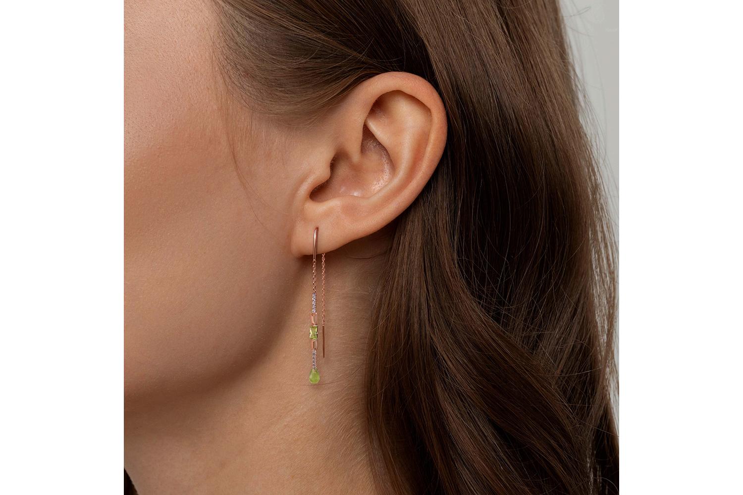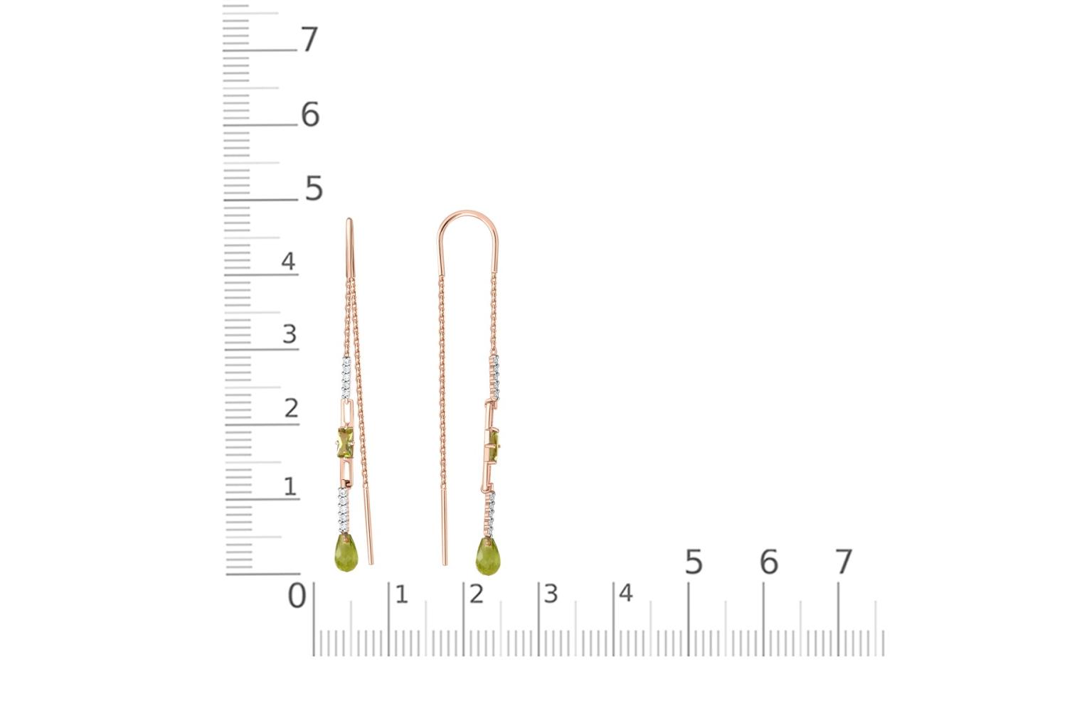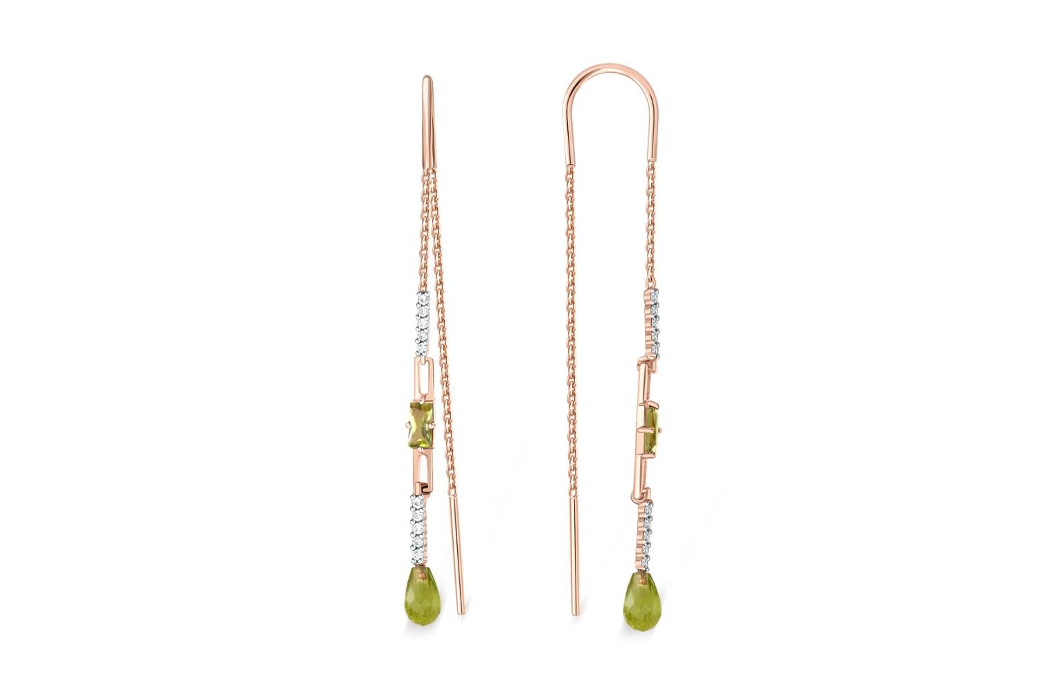 Мастера компании NEWGOLD, приложив всё свое мастерство и искусство, создали для Вас на нашем собственном производстве Серьги-продёвки из красного золота с 4 хризолитами и 20 фианитами.