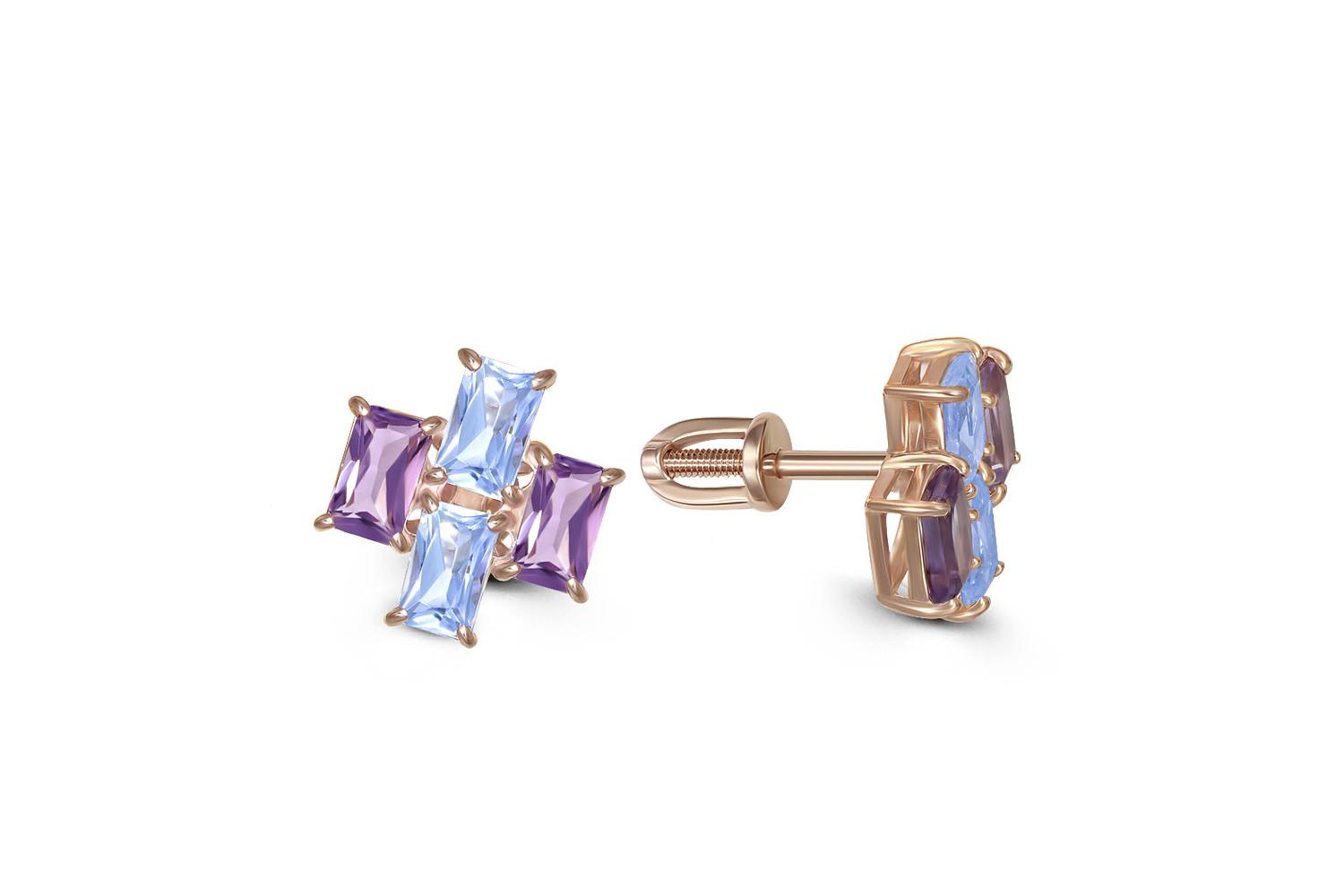 Мастера компании NEWGOLD, приложив всё свое мастерство и искусство, создали для Вас на нашем собственном производстве Серьги-пусеты из красного золота с 4 аметистами и 4 топазами sky.