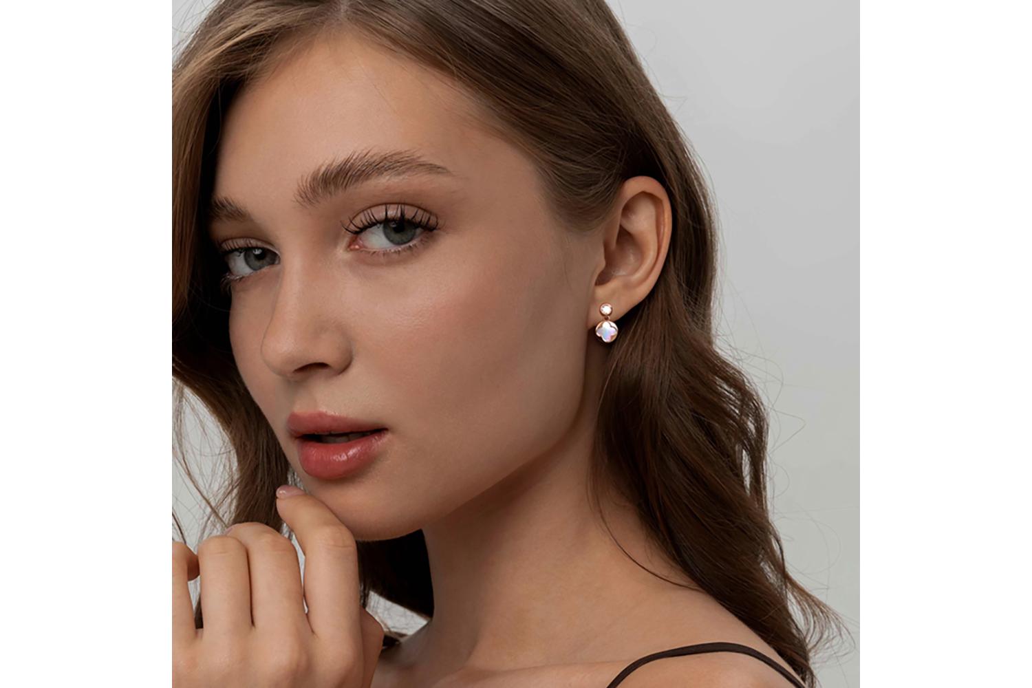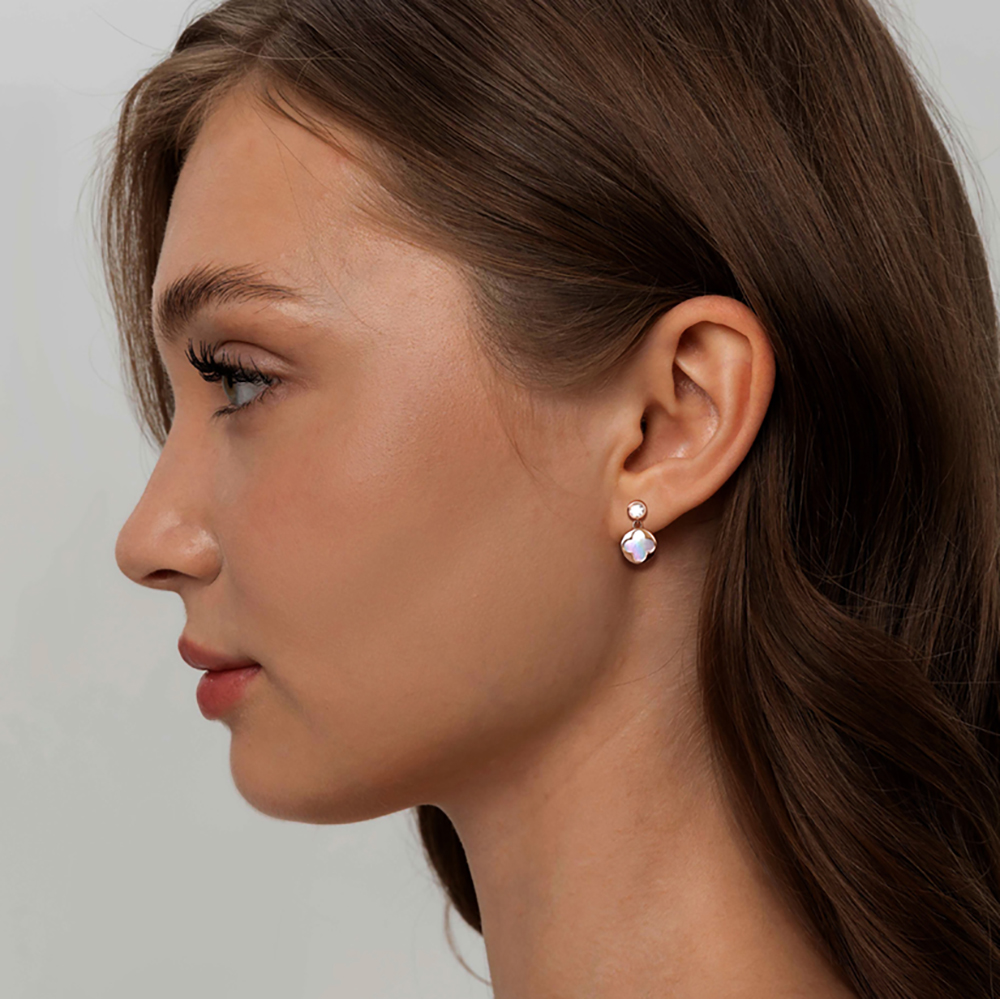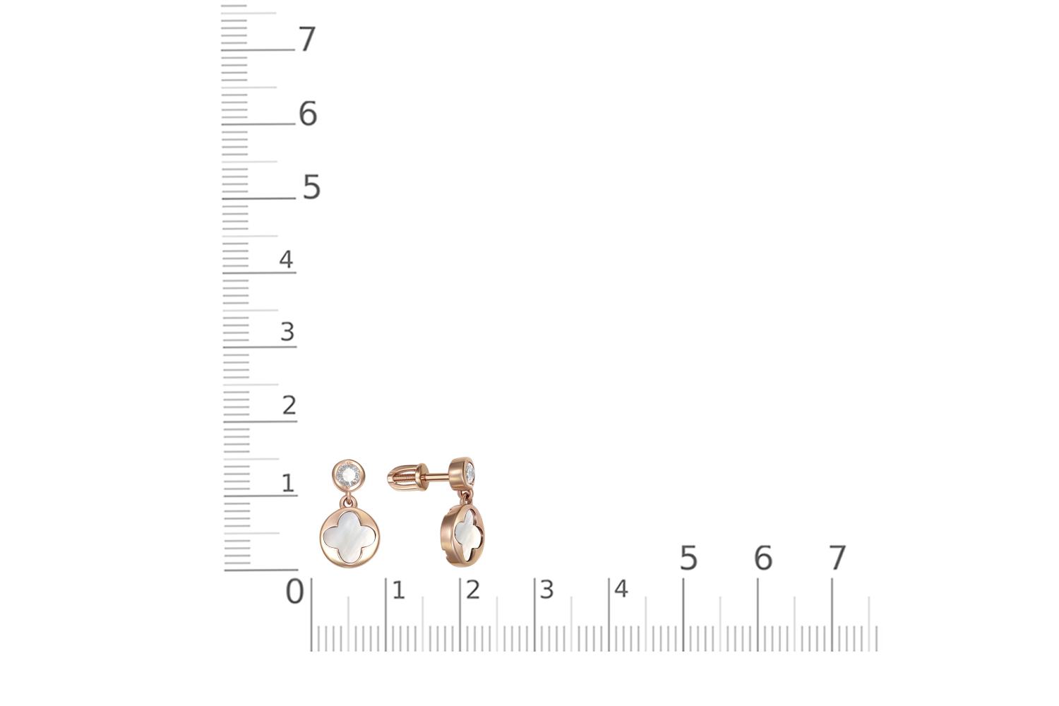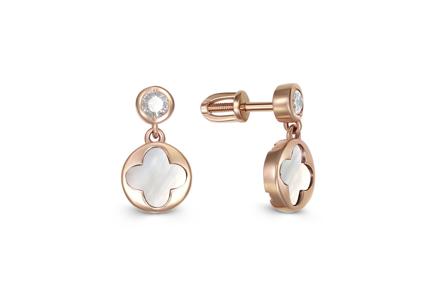 Мастера компании NEWGOLD, приложив всё свое мастерство и искусство, создали для Вас на нашем собственном производстве Серьги-пусеты Клевер из красного золота с перламутром и 2 фианитами.