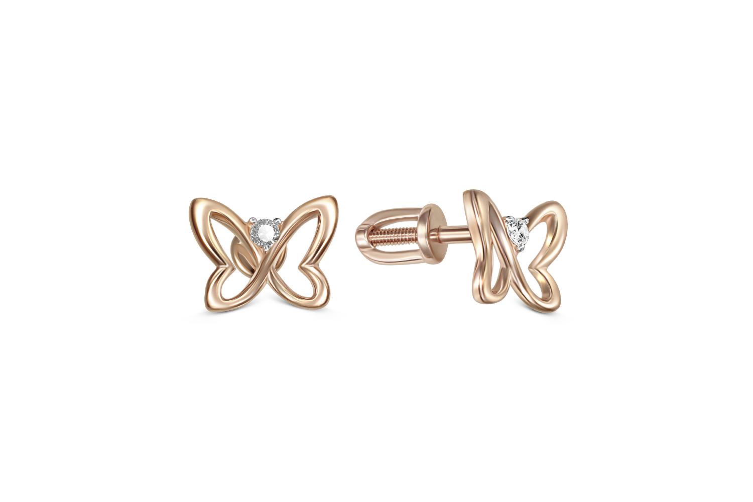 Мастера компании NEWGOLD, приложив всё свое мастерство и искусство, создали для Вас на нашем собственном производстве Серьги-пусеты Бабочки из красного золота с 2 фианитами.