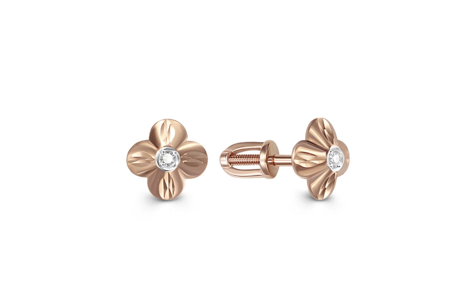 Мастера компании NEWGOLD, приложив всё свое мастерство и искусство, создали для Вас на нашем собственном производстве Серьги-пусеты Цветы из красного золота с 2 фианитами.