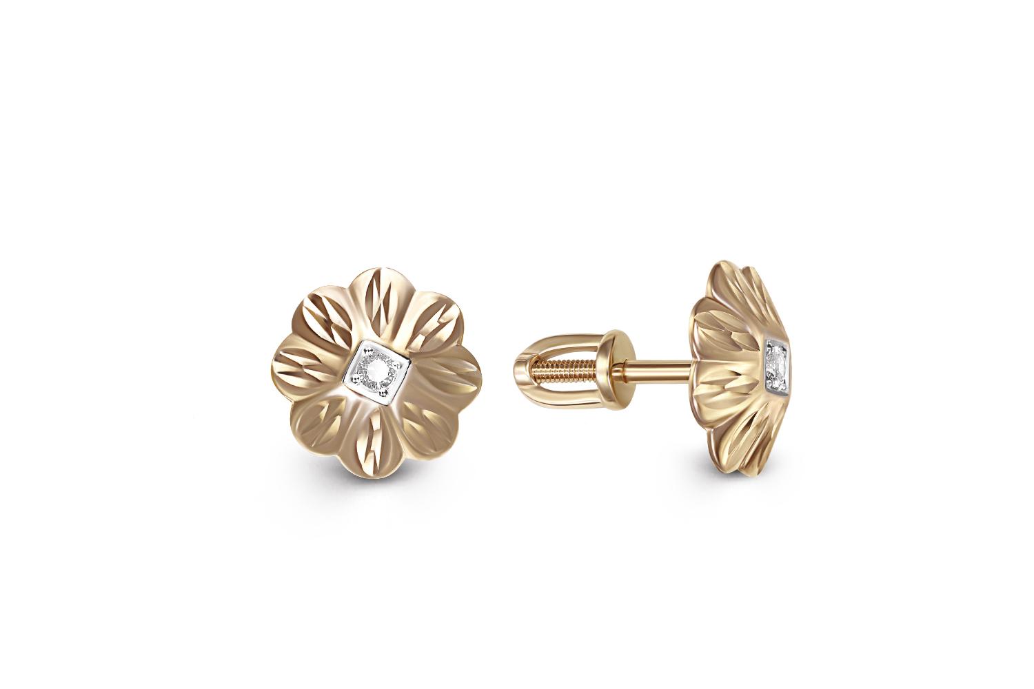 Мастера компании NEWGOLD, приложив всё свое мастерство и искусство, создали для Вас на нашем собственном производстве Серьги-пусеты Цветы из жёлтого золота с 2 фианитами.