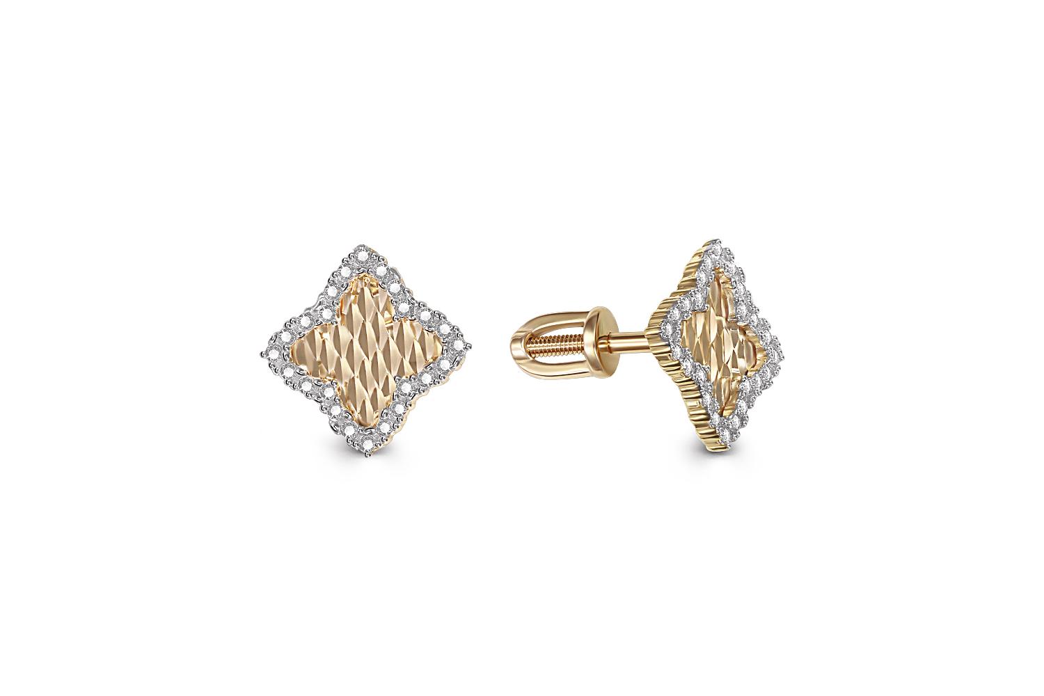 Мастера компании NEWGOLD, приложив всё свое мастерство и искусство, создали для Вас на нашем собственном производстве Серьги-пусеты Клевер из жёлтого золота с 48 фианитами.