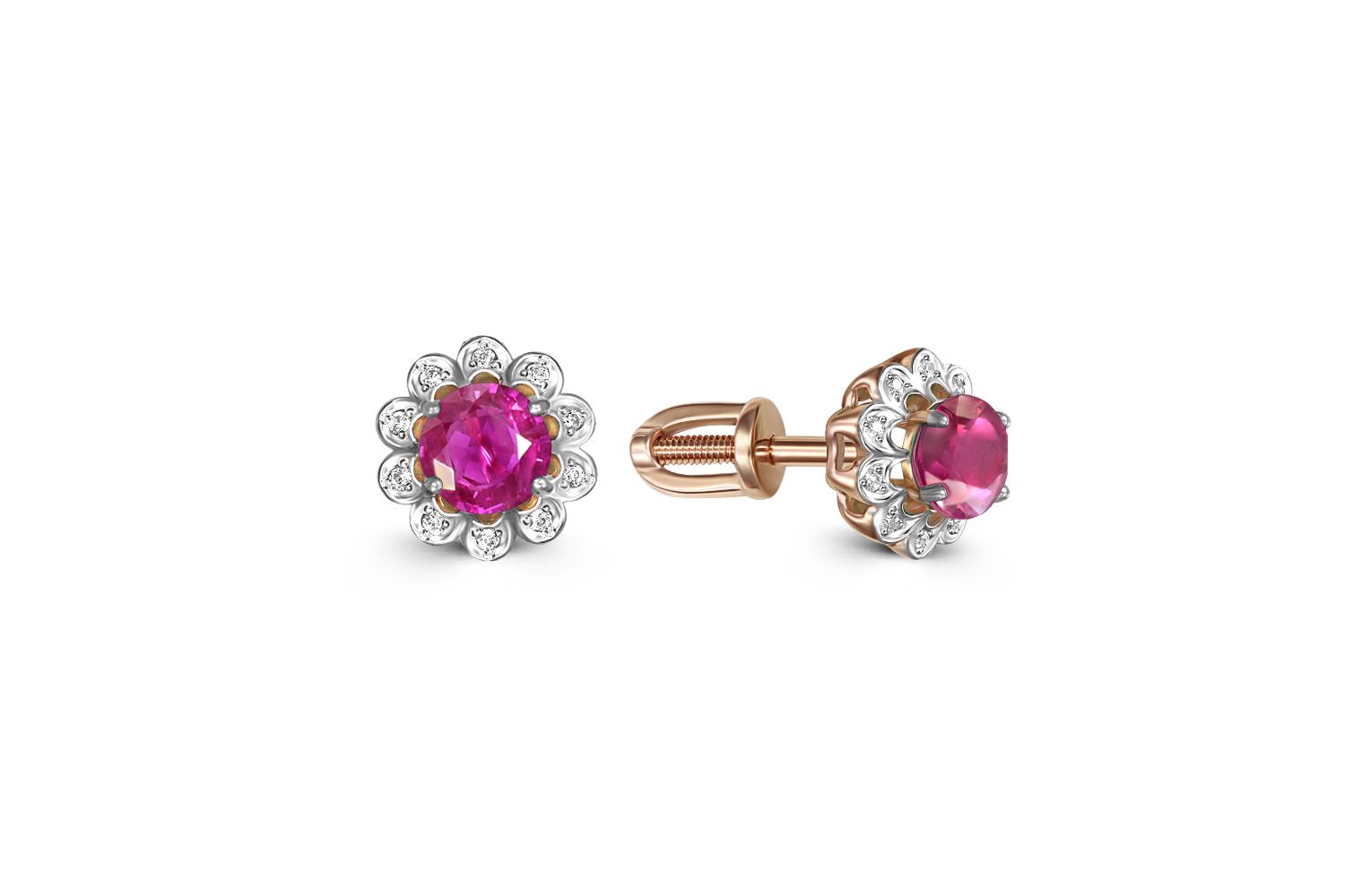 Мастера компании NEWGOLD, приложив всё свое мастерство и искусство, создали для Вас на нашем собственном производстве Серьги-пусеты Цветы из красного золота с 2 корундами и 20 бриллиантами.