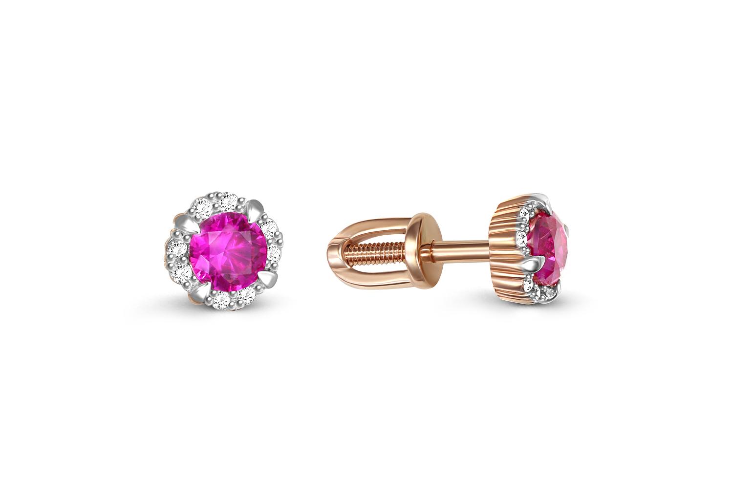Мастера компании NEWGOLD, приложив всё свое мастерство и искусство, создали для Вас на нашем собственном производстве Серьги-пусеты из красного золота с 2 корундами и 16 бриллиантами.