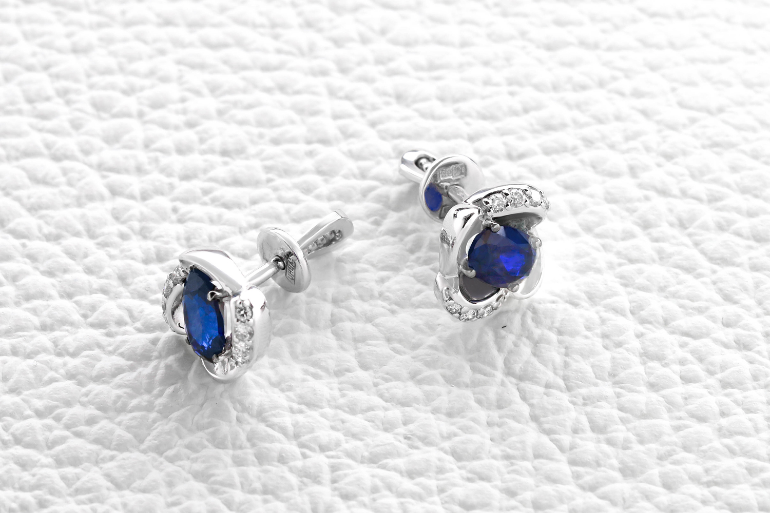 Корунд сапфир синт, количество 2 шт., огранка овал, размер 6ˣ4 ; Бриллиант, количество 12 шт., огранка Кр-17, размер 1,25 мм, цвет 2, чистота 2 ; Бриллиант, количество 4 шт., огранка Кр-17, размер 1 мм, цвет 2, чистота 2
